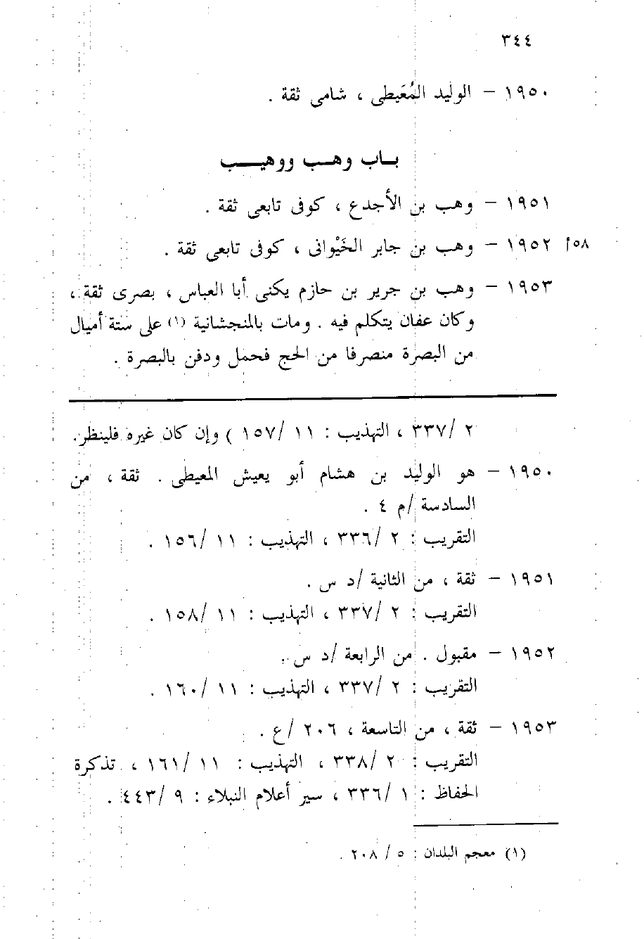 1953 - وهب بن جرير بن حَازِم يكنى أَبَا الْعَبَّاس بصرى ثِقَة وَكَانَ عَفَّان يتَكَلَّم فِيهِ وَمَات بالمنجشانية على سِتَّة اميال من الْبَصْرَة منصرفا من الْحَج فَحمل وَدفن بِالْبَصْرَةِ