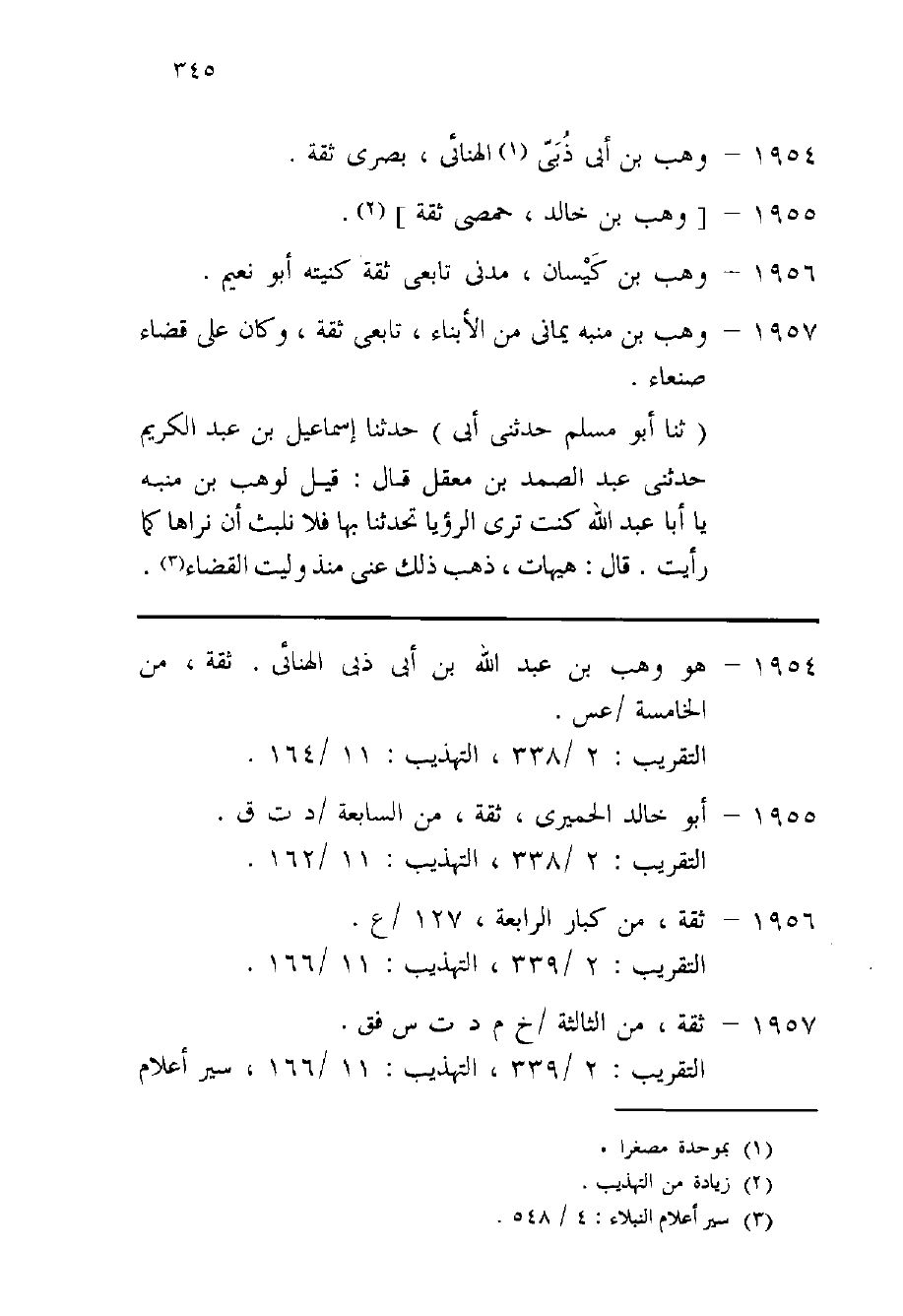 1957 - وهب بن مُنَبّه يماني من الْأَبْنَاء تَابِعِيّ ثِقَة وَكَانَ على قَضَاء صنعاء ثَنَا أَبُو مُسلم حَدثنِي أبي حَدثنَا إِسْمَاعِيل بن عبد الْكَرِيم حَدثنِي عبد الصَّمد بن معقل قَالَ قيل لوهب بن مُنَبّه يَا أَبَا عبد الله كنت ترى الرُّؤْيَا تحدثنا بهَا فَلَا نَلْبَث ان نرَاهَا كَمَا رَأَيْت قَالَ هَيْهَات ذهب ذَلِك عني مُنْذُ وليت الْقَضَاء