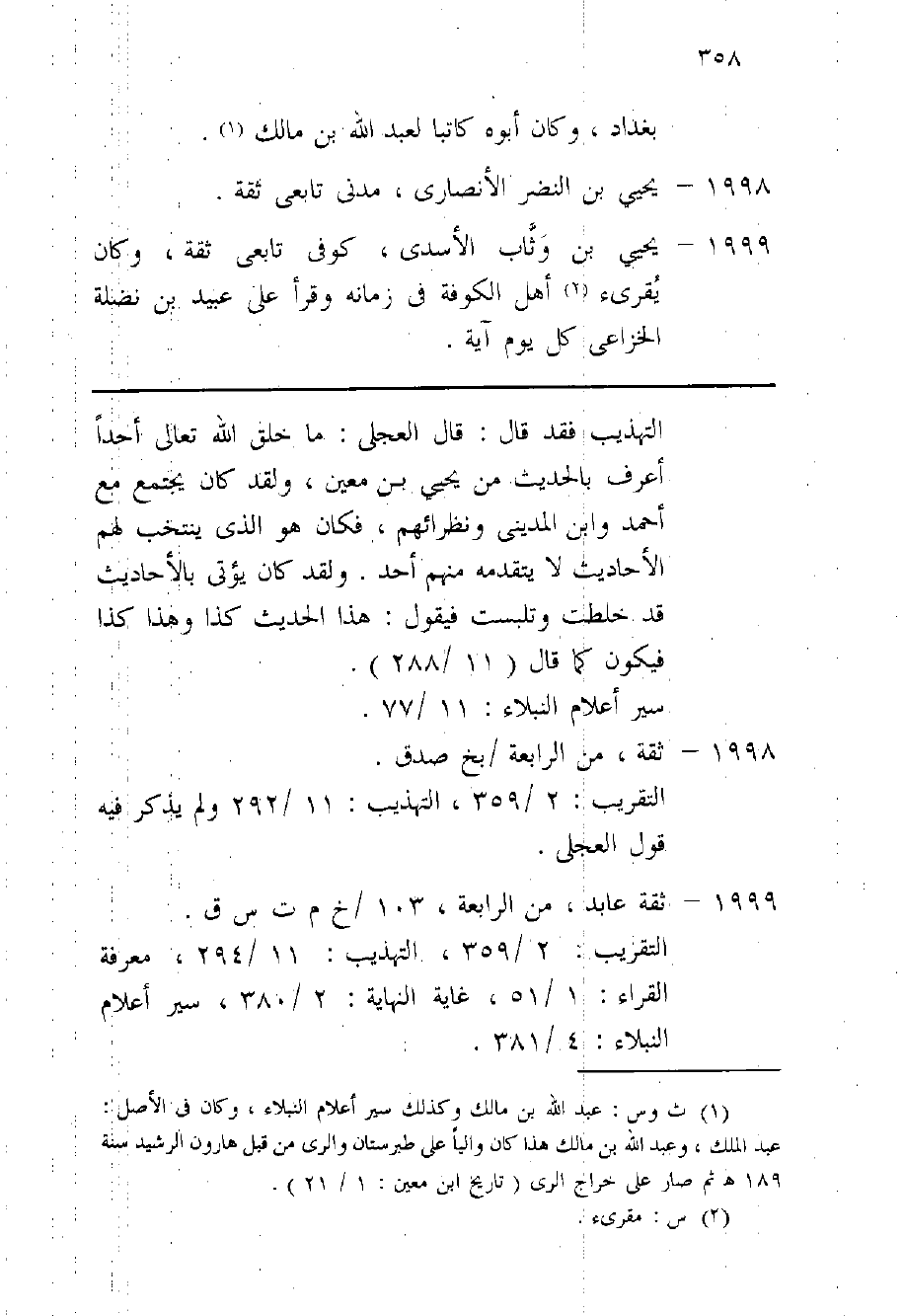 1999 - يحيى بن وثاب الْأَسدي كوفى تَابِعِيّ ثِقَة وَكَانَ يقرىء أهل الْكُوفَة فِي زَمَانه وَقَرَأَ على عبيد بن نَضْلَة الْخُزَاعِيّ كل يَوْم آيَة حَدثنَا أَبُو مُسلم حَدثنِي أبي قَالَ وَأمر الْحجَّاج بن يُوسُف بِالْكُوفَةِ أَن لَا يؤم الا عَرَبِيّ فَقَالَ لَهُ قومه قد أَمر الْحجَّاج أَن لَا يؤم إِلَّا عَرَبِيّ فَقَالَ لَيْسَ عَن مثلي نهي أَنا لَاحق بالعرب ثمَّ أَتَى الْحجَّاج فَقَرَأَ فَقَالَ الْحجَّاج من هَذَا قَالُوا هَذَا يحيى بن وثاب قَالَ مَاله قَالُوا أمرت ان لَا يؤم الا عَرَبِيّ فنحاه قومه وَهُوَ مولى فَقَالَ لَيْسَ عَن مثل هَذَا نهيت ليصل بهم فصلى بهم الْفجْر وَالظّهْر وَالْعصر وَالْمغْرب وَالْعشَاء فَلَمَّا سلم قَالَ اطْلُبُوا إِمَامًا غَيْرِي انا مَا أُصَلِّي بكم إِنَّمَا أردْت ان لَا تستبدلوني فاما ان صَار الْأَمر إِلَيّ فلست أُصَلِّي بكم
