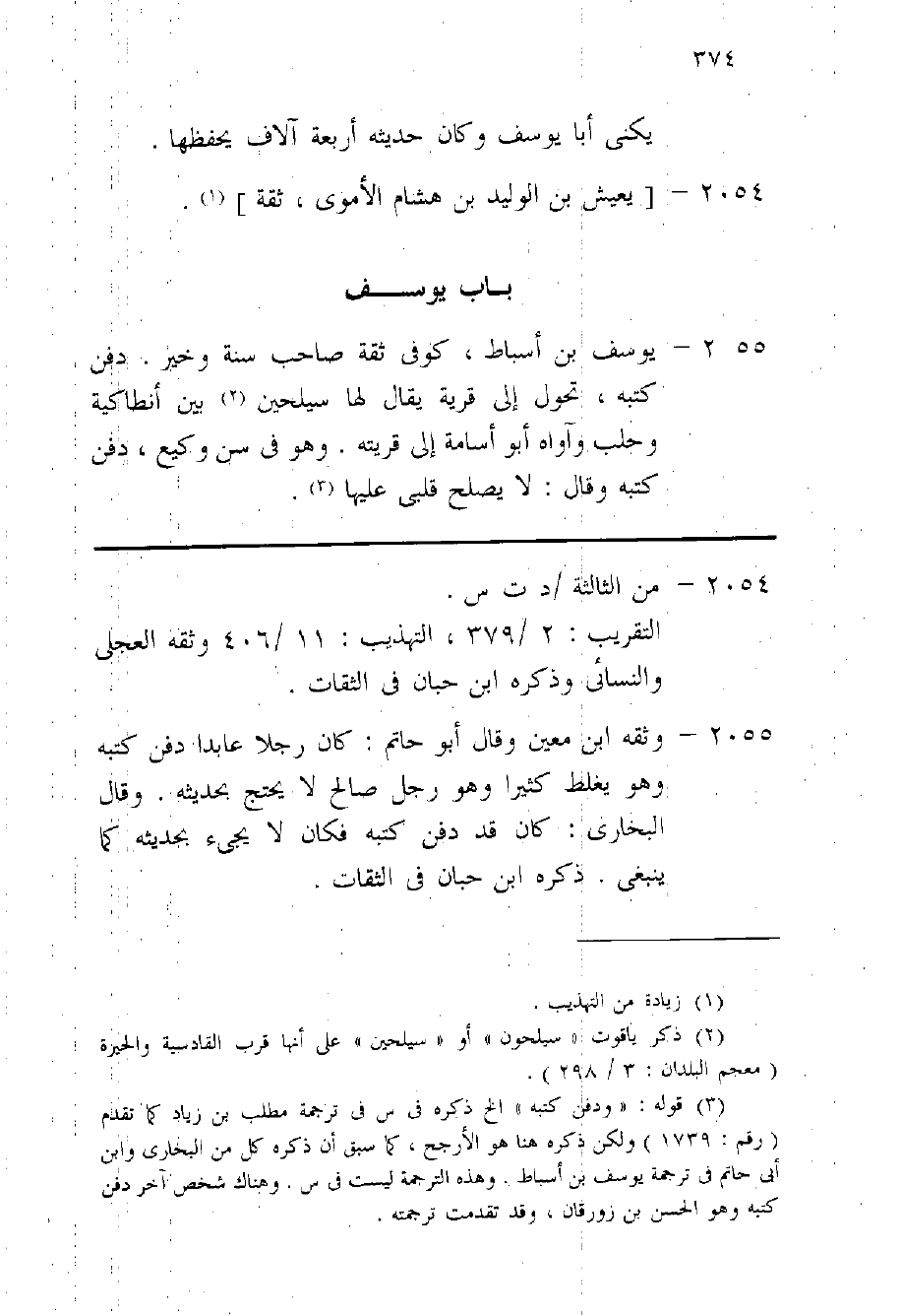 2055 - يُوسُف بن أَسْبَاط كوفى ثِقَة صَاحب سنة وَخير دفن كتبه تحول إِلَى قَرْيَة يُقَال لَهَا سيلحين بَين أنطاكية وحلب وآواه أَبُو أُسَامَة إِلَى قريته وَهُوَ فِي سنّ وَكِيع دفن كتبه وَقَالَ لَا يصلح قلبِي عَلَيْهَا