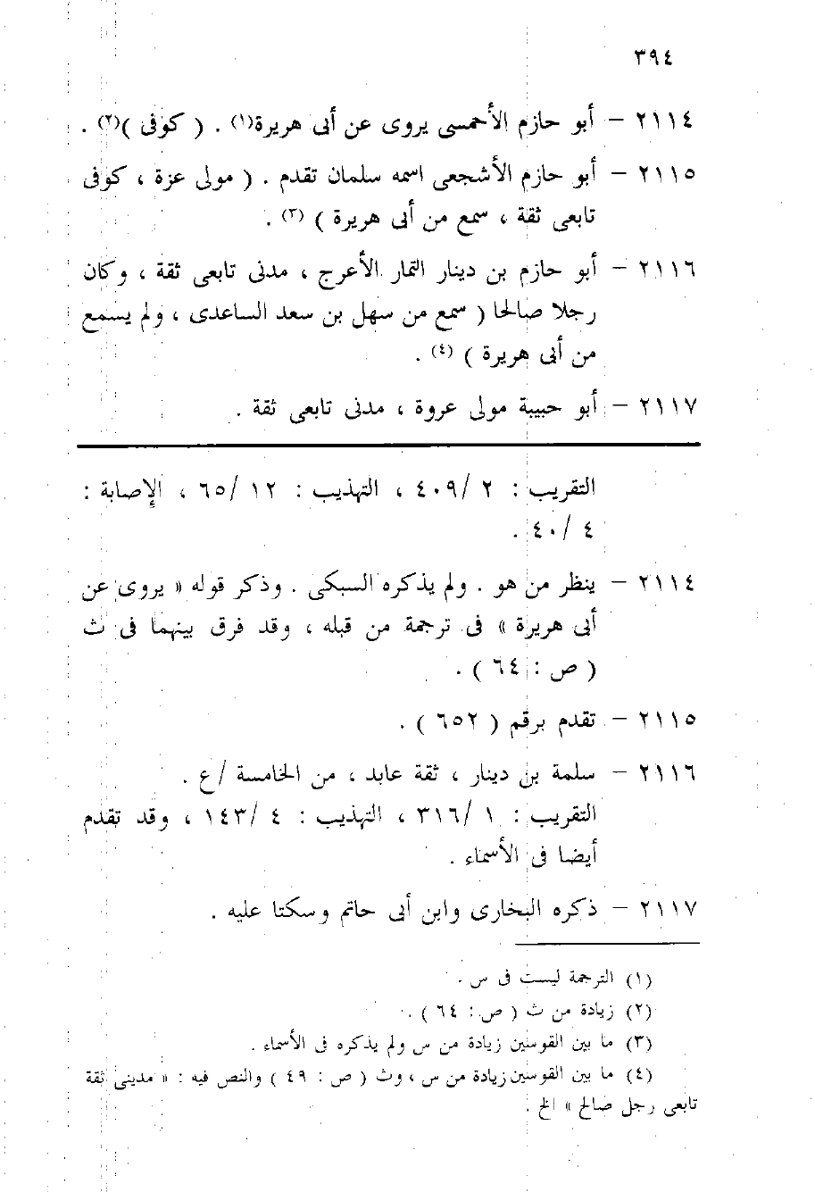 2116 - أَبُو حَازِم بن دِينَار التمار الْأَعْرَج مدنِي تَابِعِيّ ثِقَة وَكَانَ رجلا صَالحا سمع من سهل بن سعد السَّاعِدِيّ وَلم يسمع من أبي هُرَيْرَة