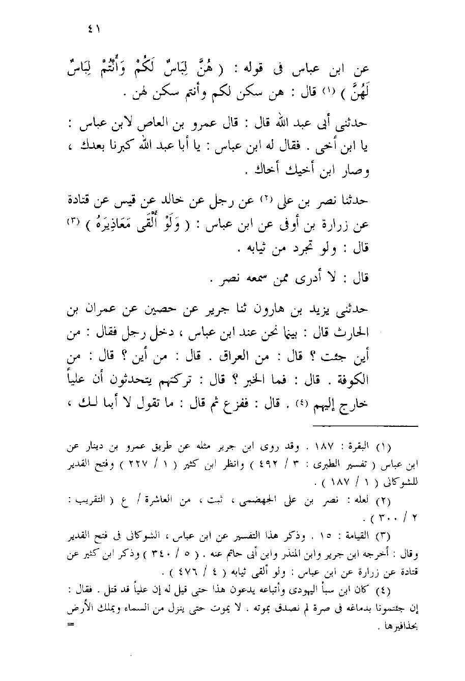 عَن إِبْرَاهِيم بن ميسرَة عَن طَاوس عَن بن عَبَّاس فِي قَوْله هن لِبَاس لكم وَأَنْتُم لِبَاس لَهُنَّ قَالَ هن سكن لكم وَأَنْتُم سكن لَهُنَّ حَدثنِي أبي عبد الله قَالَ قَالَ عَمْرو بن الْعَاصِ لِابْنِ عَبَّاس يَا بن أخي فَقَالَ لَهُ بن عَبَّاس يَا أَبَا عبد الله كبرنا بعْدك وَصَارَ بن أَخِيك أَخَاك حَدثنَا نصر بن عَليّ عَن رجل عَن خَالِد عَن قيس عَن قَتَادَة عَن زُرَارَة بن أوفى عَن بن عَبَّاس وَلَو ألْقى معاذيره قَالَ وَلَو تجرد من ثِيَابه قَالَ لَا أَدْرِي مِمَّن سَمعه نصر حَدثنِي يزِيد بن هَارُون ثَنَا جرير عَن حُصَيْن عَن عمرَان بن الْحَارِث قَالَ بَيْنَمَا نَحن عِنْد بن عَبَّاس دخل رجل فَقَالَ من أَيْن جِئْت قَالَ من الْعرَاق قَالَ من أَيْن قَالَ من الْكُوفَة قَالَ فَمَا الْخَبَر قَالَ تَركتهم يتحدثون ان عليا خَارج إِلَيْهِم قَالَ فَفَزعَ ثمَّ قَالَ مَا تَقول لَا أَبَا لَك