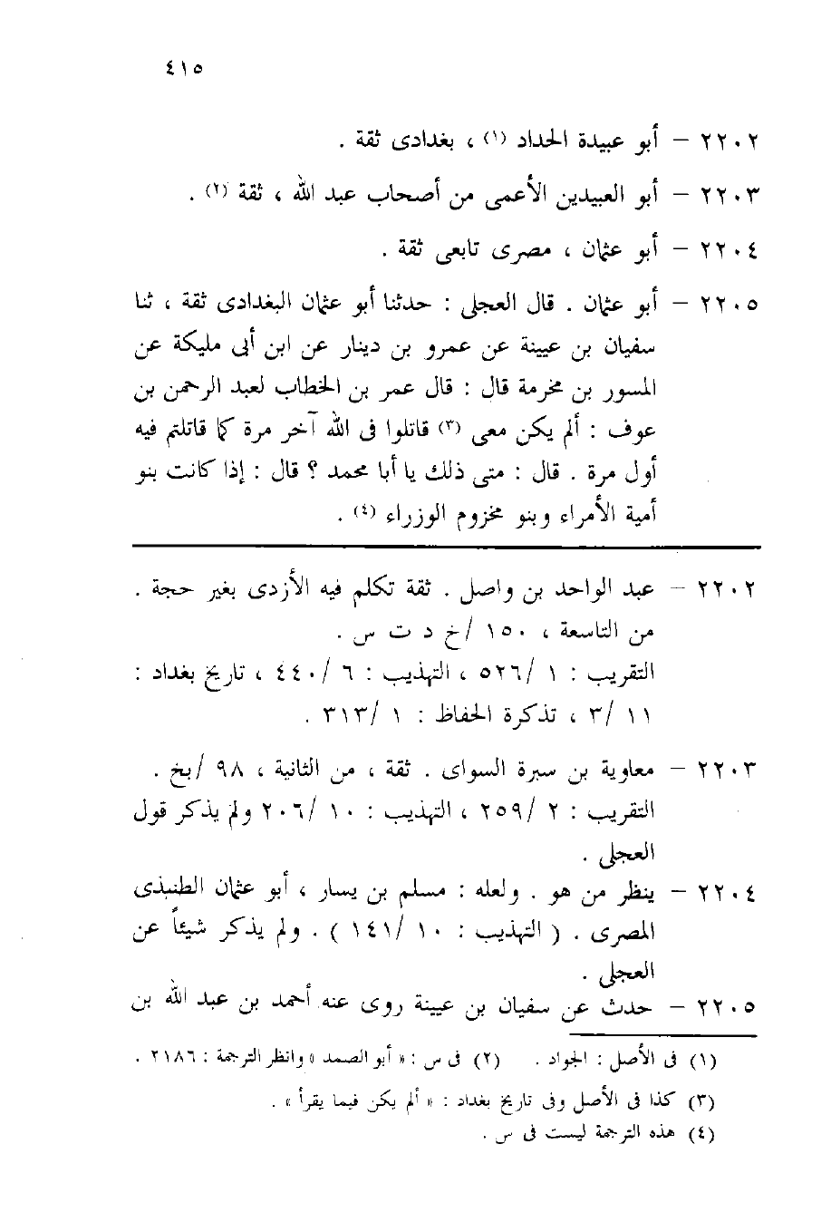 2205 - أَبُو عُثْمَان قَالَ الْعجلِيّ حَدثنَا أَبُو عُثْمَان الْبَغْدَادِيّ ثِقَة ثَنَا سُفْيَان بن عُيَيْنَة عَن عَمْرو بن دِينَار عَن بن أبي مليكَة عَن الْمسور بن مخرمَة قَالَ قَالَ عمر بن الْخطاب لعبد الرَّحْمَن بن عَوْف ألم يكن معي قَاتلُوا فِي الله آخر مرّة كَمَا قاتلتم فِيهِ أول مرّة قَالَ مَتى ذَلِك يَا أَبَا مُحَمَّد قَالَ إِذا كَانَت بَنو أُميَّة الْأُمَرَاء وَبَنُو مَخْزُوم الوزراء