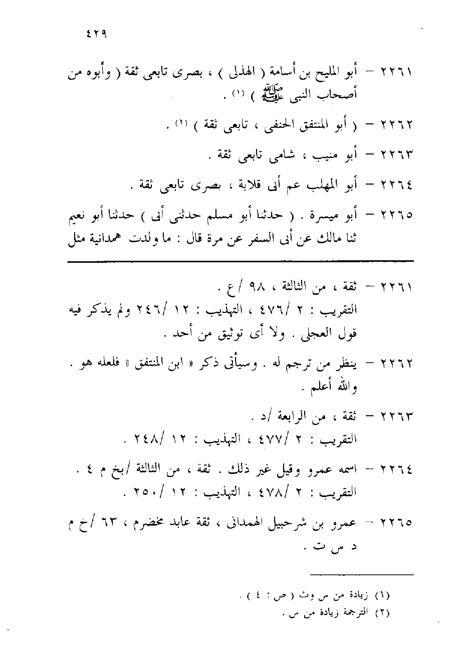 2265 - أَبُو ميسرَة حَدثنَا أَبُو مُسلم حَدثنِي أبي حَدثنَا أَبُو نعيم ثَنَا مَالك عَن أبي السّفر عَن مرّة قَالَ مَا ولدت همدانية مثل أبي ميسرَة قيل وَلَا مَسْرُوق قَالَ وَلَا مَسْرُوق حَدثنَا أَبُو مُسلم حَدثنِي أبي حَدثنَا يزِيد بن هَارُون عَن الْعَوام عَن عَمْرو بن مرّة قَالَ كَانَ أَبُو ميسرَة من أفاضل أَصْحَاب عبد الله ثِقَة
