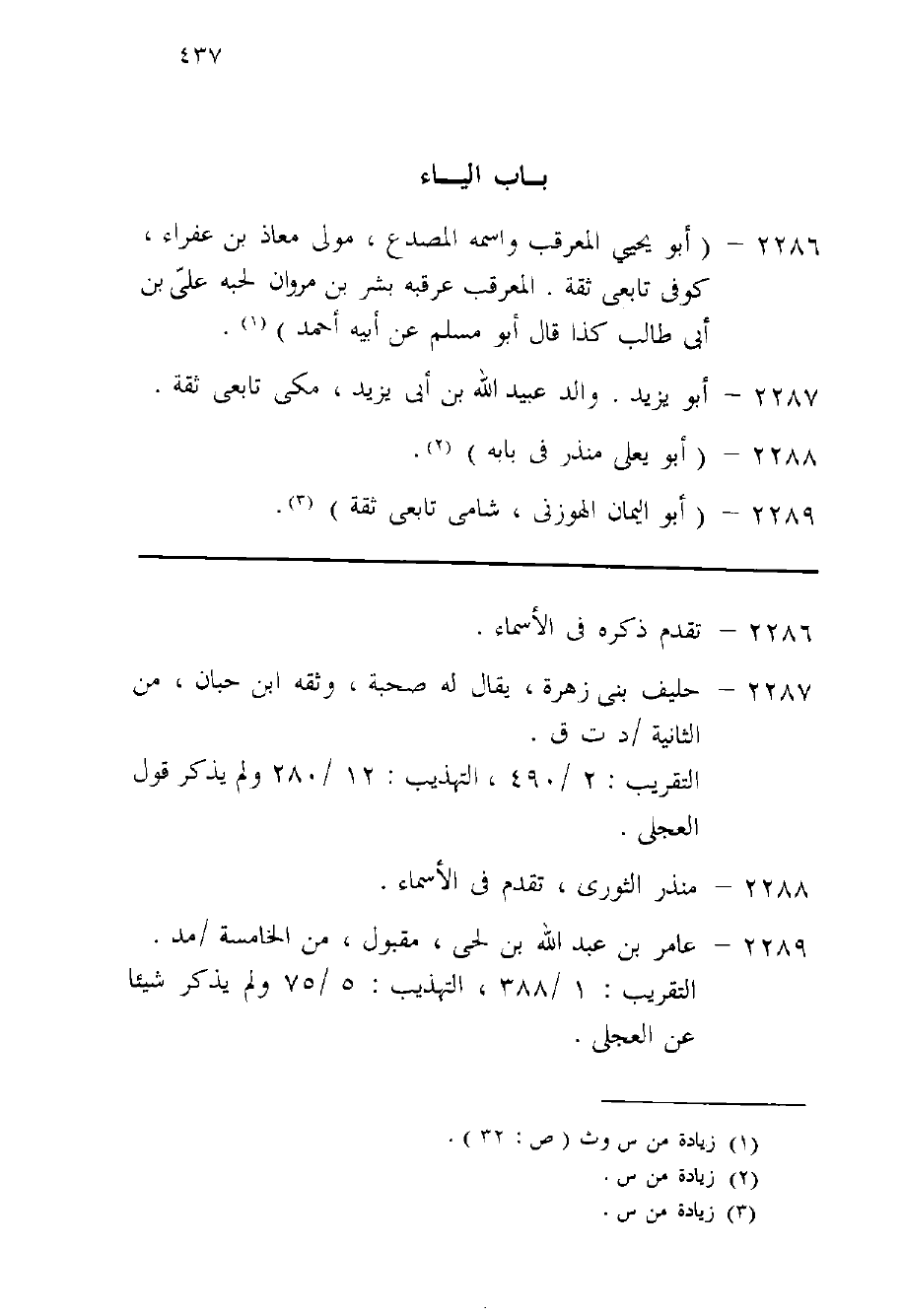 2286 - أَبُو يحيى المعرقب واسْمه المصدع مولى معَاذ بن عفراء كوفى تَابِعِيّ ثِقَة المعرقب عرقبه بشر بن مَرْوَان لحبه على بن أبي طَالب كَذَا قَالَ أَبُو مُسلم عَن أَبِيه أَحْمد