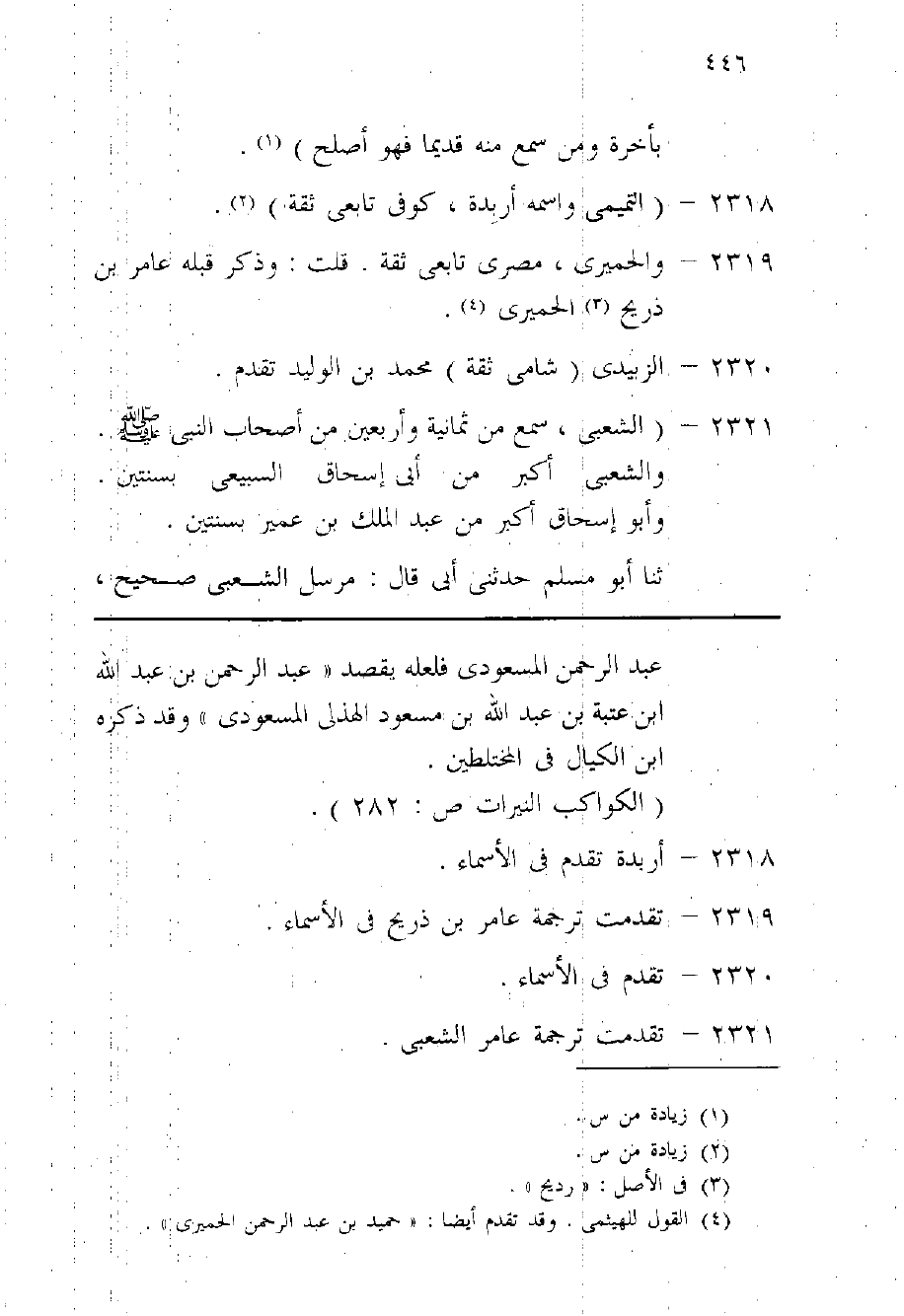 2321 - الشّعبِيّ سمع من ثَمَانِيَة وَأَرْبَعين من أَصْحَاب النَّبِي صلى الله عَلَيْهِ وَسلم وَالشعْبِيّ أكبر من أبي إِسْحَاق السبيعِي بِسنتَيْنِ وَأَبُو إِسْحَاق أكبر من عبد الْملك بن عُمَيْر بِسنتَيْنِ ثَنَا أَبُو مُسلم حَدثنِي أبي قَالَ مُرْسل الشّعبِيّ صَحِيح لَا يكَاد يُرْسل إِلَّا صَحِيحا أهل الْيمن أرق قوم حَدثنَا أَبُو مُسلم قَالَ سَمِعت أبي أَحْمد يَقُول سَمِعت أبي عبد الله يَقُول قَالَ الشّعبِيّ لِأَن أصلى وَأَنا جنب أحب إِلَيّ من أَن أُعِيد للشَّيْطَان وضُوءًا