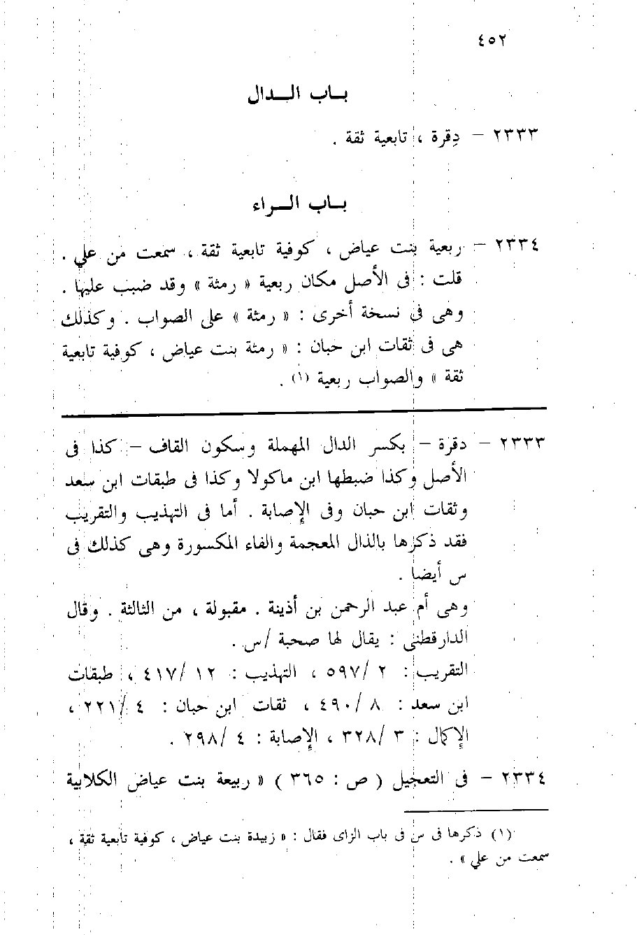 2334 - ربعية بنت عِيَاض كوفية تابعية ثِقَة سَمِعت من على قلت فِي الأَصْل مَكَان ربعية رمثة وَقد ضبب عَلَيْهَا وهى فِي نُسْخَة أُخْرَى رمثة على الصَّوَاب وَكَذَلِكَ هِيَ فِي ثِقَات بن حبَان رمثة بنت عِيَاض كوفية تابعية ثِقَة وَالصَّوَاب ربعية