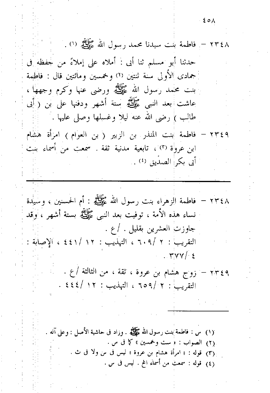 2349 - فَاطِمَة بنت الْمُنْذر بن الزبير بن الْعَوام امْرَأَة هِشَام بن عُرْوَة تابعية مَدَنِيَّة ثِقَة سَمِعت من أَسمَاء بنت أبي بكر الصّديق