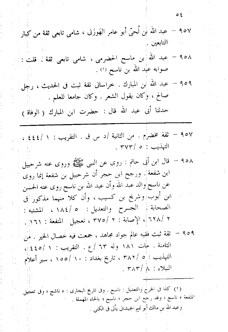 959 - عبد الله بن الْمُبَارك خراساني ثِقَة ثَبت فِي الحَدِيث رجل صَالح وَكَانَ يَقُول الشّعْر وَكَانَ جَامعا للْعلم حَدثنَا أبي عبد الله قَالَ حضرت بن الْمُبَارك الْوَفَاة