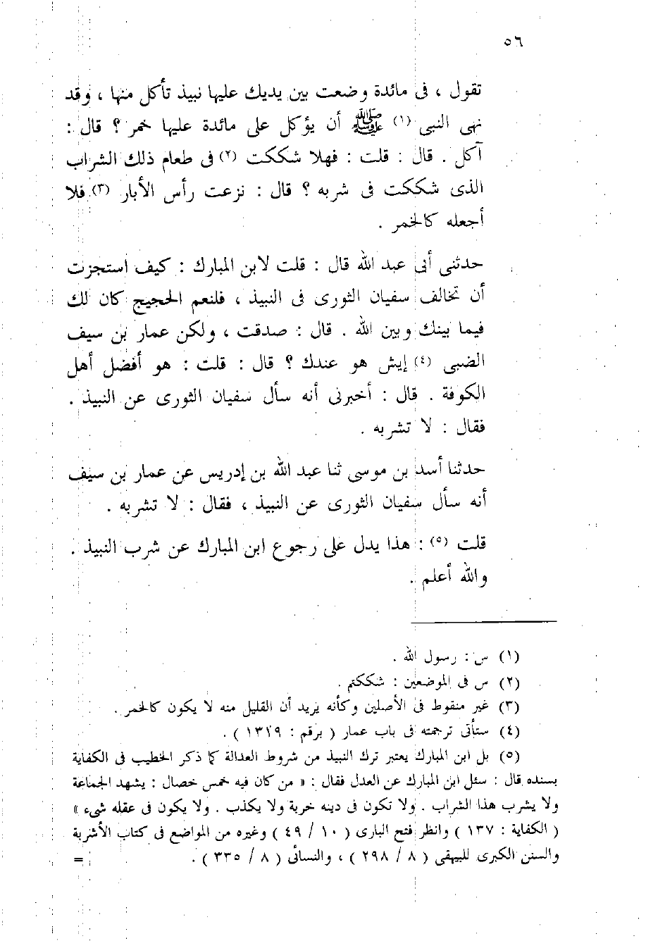 تَقول فِي مائدة وضعت بَين يَديك عَلَيْهَا نَبِيذ تَأْكُل مِنْهَا وَقد نهى النَّبِي صلى الله عَلَيْهِ وَسلم أَن يُؤْكَل على مائدة عَلَيْهَا خمر قَالَ آكل قَالَ قلت فَهَلا شَككت فِي طَعَام ذَلِك الشَّرَاب الَّذِي شَككت فِي شربه قَالَ نزعت رَأس الْأَبَّار فَلَا أجعله كَالْخمرِ حَدثنِي أبي عبد الله قَالَ قلت لِابْنِ الْمُبَارك كَيفَ استجزت ان تخَالف سُفْيَان الثَّوْريّ فِي النَّبِيذ فلنعم الحجيج كَانَ لَك فِيمَا بَيْنك وَبَين الله قَالَ صدقت وَلَكِن عمار بن سيف الضَّبِّيّ إيش هُوَ عنْدك قَالَ قلت هُوَ أفضل أهل الْكُوفَة قَالَ أَخْبرنِي انه سَأَلَ سُفْيَان الثَّوْريّ عَن النَّبِيذ فَقَالَ لَا تشربه حَدثنَا أَسد بن مُوسَى ثَنَا عبد الله بن إِدْرِيس عَن عمار بن سيف انه سَأَلَ سُفْيَان الثَّوْريّ عَن النَّبِيذ فَقَالَ لَا تشربه قلت هَذَا يدل على رُجُوع بن الْمُبَارك عَن شرب النَّبِيذ وَالله أعلم