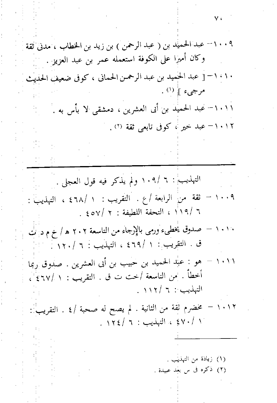1009 - عبد الحميد بن عبد الرَّحْمَن بن زيد بن الْخطاب مدنِي ثِقَة وَكَانَ أَمِيرا على الْكُوفَة اسْتَعْملهُ عمر بن عبد الْعَزِيز