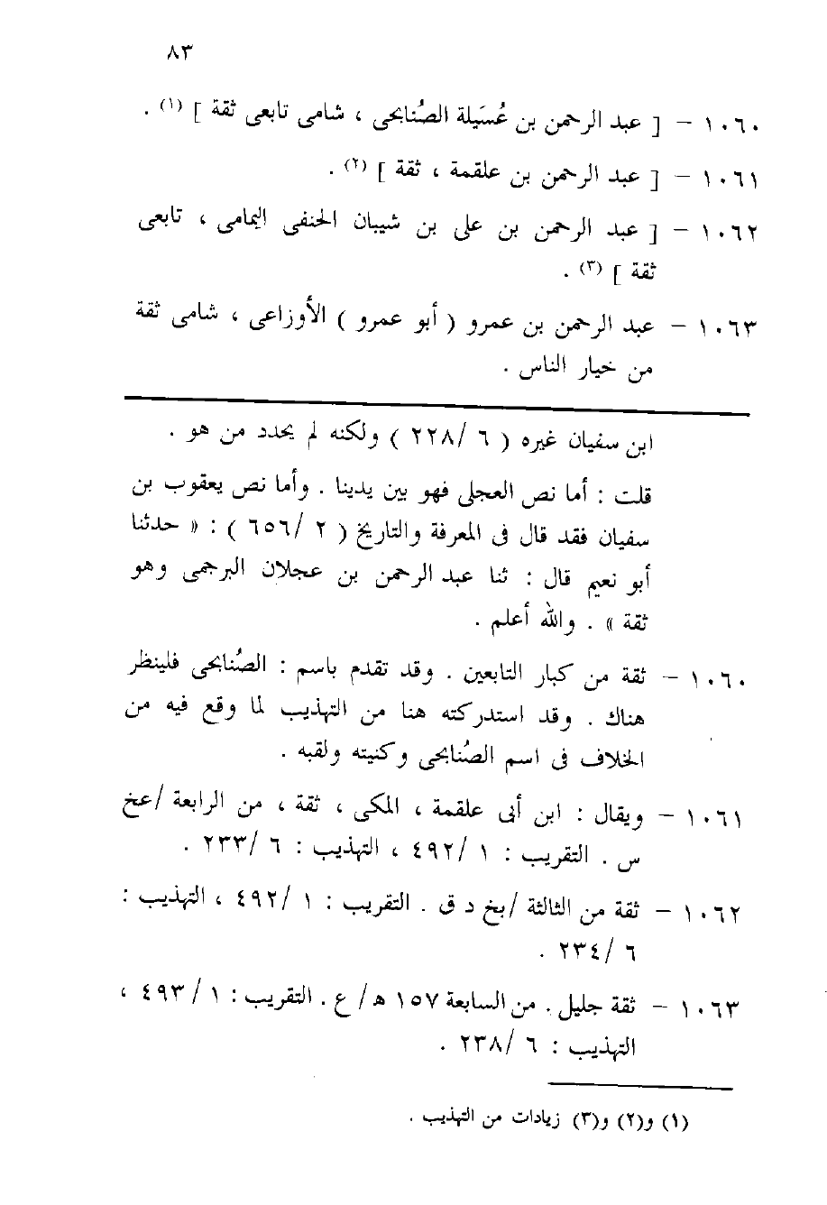 1063 - عبد الرَّحْمَن بن عَمْرو أَبُو عَمْرو الْأَوْزَاعِيّ شَامي ثِقَة من خِيَار النَّاس حَدثنِي أبي عبد الله قَالَ جَاءَ رجل إِلَى سُفْيَان الثَّوْريّ فَقَالَ لَهُ اكْتُبْ إِلَى الْأَوْزَاعِيّ يحدثني فَقَالَ أما إِنِّي اكْتُبْ لَك إِلَيْهِ وَلَا أَرَاك تَجدهُ إِلَّا مَيتا لأنى رَأَيْت رَيْحَانَة رفعت من قبل الْمغرب وَلَا أرَاهُ إِلَّا لمَوْت الْأَوْزَاعِيّ فَأَتَاهُ فَإِذا هُوَ قد مَاتَ