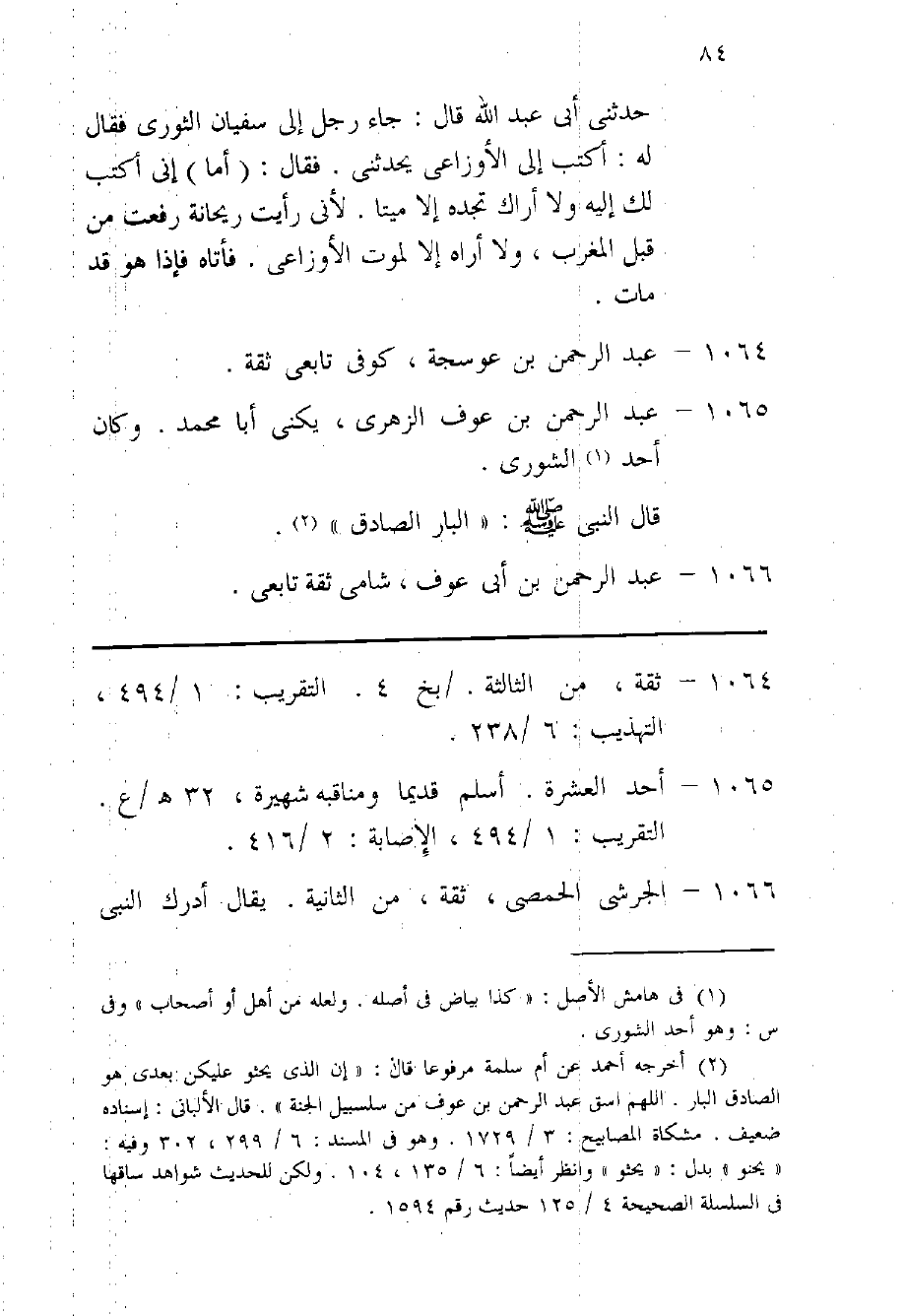 1065 - عبد الرَّحْمَن بن عَوْف الزُّهْرِيّ يكنى أَبَا مُحَمَّد وَكَانَ أحد الشورى قَالَ النَّبِي صلى الله عَلَيْهِ وَسلم الْبَار الصَّادِق
