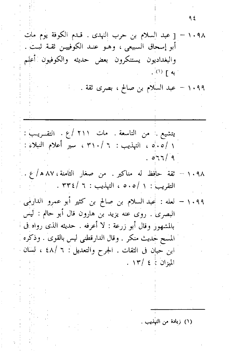 1098 - عبد السَّلَام بن حَرْب النَّهْدِيّ قدم الْكُوفَة يَوْم مَاتَ أَبُو إِسْحَاق السبيعِي وَهُوَ عِنْد الْكُوفِيّين ثِقَة ثَبت والبغداديون يستنكرون بعض حَدِيثه والكوفيون أعلم بِهِ