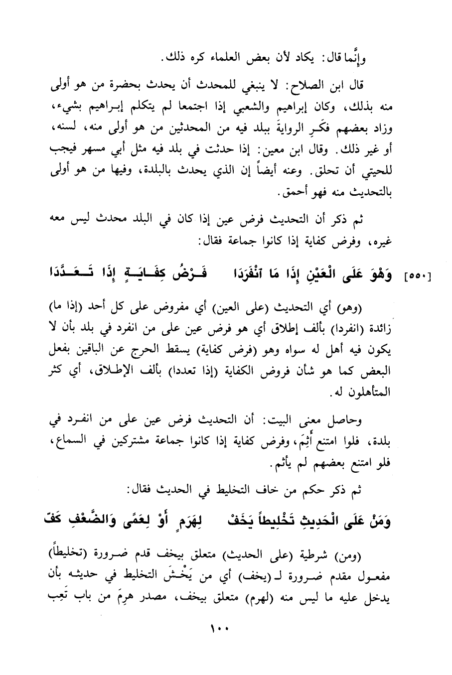 وحاصل معنى البيت: أن التحديث فرض عين على من انفرد في بلدة، فلوا امتنع أثِمَ، وفرض كفاية إذا كانوا جماعة مشتركين في السماع، فلو امتنع بعضهم لم يأثم.