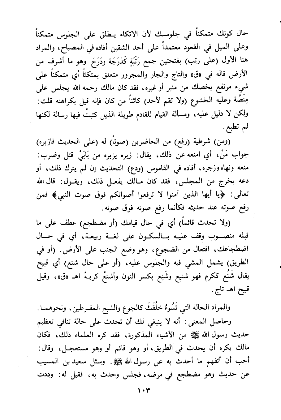 (ولا تحدث قائماً) أي في حال قيامك (أو مضطجع) عطف على ما قبله منصوب وقف عليه بالسكون على لغة ربيعة، أي في حال اضطجاعك، افتعال من الضجوع، وهو وضع الجنب على الأرض. (أو في الطريق) يشمل المشي فيه والجلوس عليه، (أو على حال شنع) أي قبيح يقال شَنُع ككرم فهو شنيع وشَنِع بكسر النون وأشنعُ كريهٌ. اهـ " ق "، وقيل قبيح. اهـ تاج.