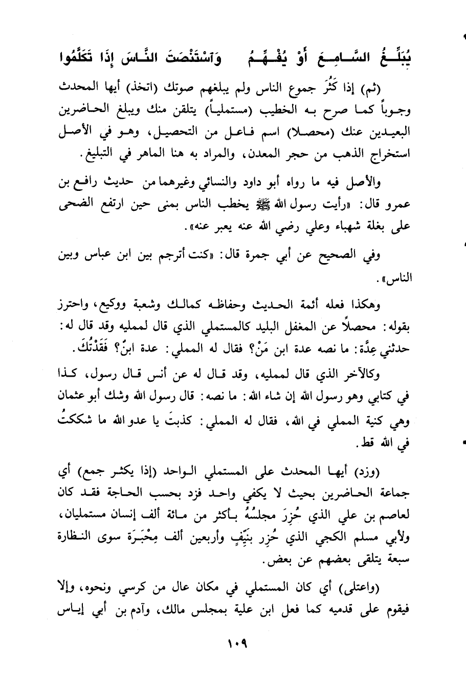 (واعتلى) أي كان المستملي في مكان عال من كرسي ونحوه، وإلا فيقوم على قدميه كما فعل ابن علية بمجلس مالك، وآدم بن أبي إياس