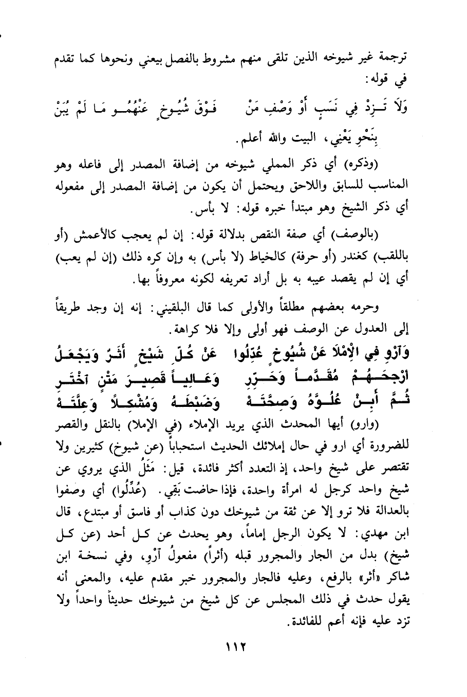 (وَارو) أيها المحدث الذي يريد الإملاء (في الإملا) بالنقل والقصر للضرورة أي ارو في حال إملائك الحديث استحباباً (عن شيوخ) كثيرين ولا تقتصر على شيخ واحد، إذ التعدد أكثر فائدة، قيل: مَثَلُ الذي يروي عن شيخ واحد كرجل له امرأة واحدة، فإذا حاضت بَقِي. (عُدِّلُوا) أي وصفوا بالعدالة فلا ترو إلا عن ثقة من شيوخك دون كذاب أو فاسق أو مبتدع، قال ابن مهدي: لا يكون الرجل إماماً، وهو يحدث عن كل أحد (عَنْ كُلِّ شَيْخٍ) بدل من الجار والمجرور قبله (أثراً) مفعولُ ارْوِ، وفي نسخة ابن شاكرٍ " أثر " بالرفع، وعليه فالجار والمجرور خبر مقدم عليه، والمعنى أنه يقول حدث في ذلك المجلس عن كل شيخ من شيوخك حديثاً واحداً ولا تزد عليه فإنه أعم للفائدة.