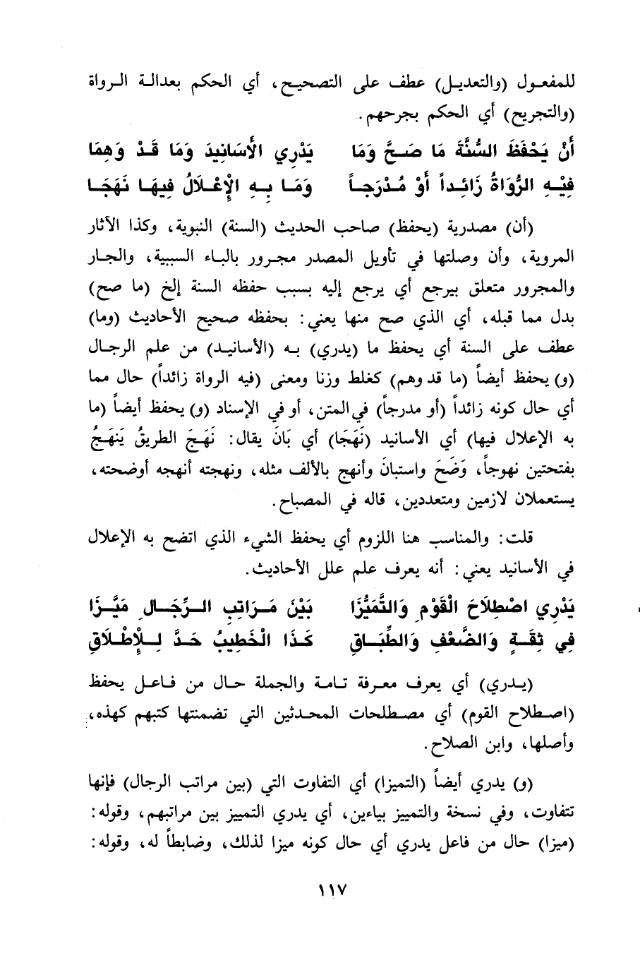 (أن) مصدرية (يحفظ) صاحب الحديث (السنة) النبوية، وكذا الآثار المروية، وأن وصلتها في تأويل المصدر مجرور بالباء السببية، والجار والمجرور متعلق بيرجع أي يرجع إليه بسبب حفظه السنة إلخ (ما صح) بدل مما قبله، أي الذي صح منها يعني: بحفظه صحيح الأحاديث (وما) عطف على السنة أي يحفظ ما (يدري) به (الأسانيد) من علم الرجال (و) يحفظ أيضاً (ما قد وهم) كغلط وزنا ومعنى (فيه الرواة زائداً) حال مما أي حال كونه زائداً (أو مدرجاً) في المتن، أو في الإسناد (و) يحفظ أيضاً (ما به الإعلال فيها) أي الأسانيد (نَهَجَا) أي بَانَ يقال: نَهَجَ الطريقُ يَنهَجُ بفتحتين نهوجاً، وَضَحَ واستبانَ وأنهج بالألف مثله، ونهجته أنهجه أوضحته، يستعملان لازمين ومتعددين، قاله في المصباح.