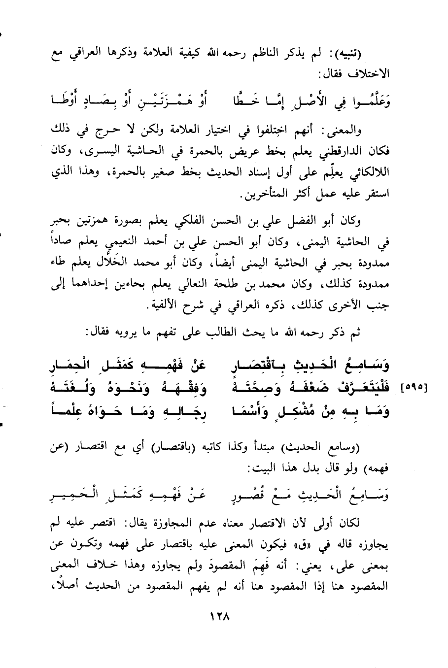 والمعنى: أنهم اخِتلفوا في اختيار العلامة ولكن لا حرج في ذلك فكان الدارقطني يعلم بخط عريض بالحمرة في الحاشية اليسرى، وكان اللالكائي يعلِّم على أول إسناد الحديث بخط صغير بالحمرة، وهذا الذي استقر عليه عمل أكثر المتأخرين.