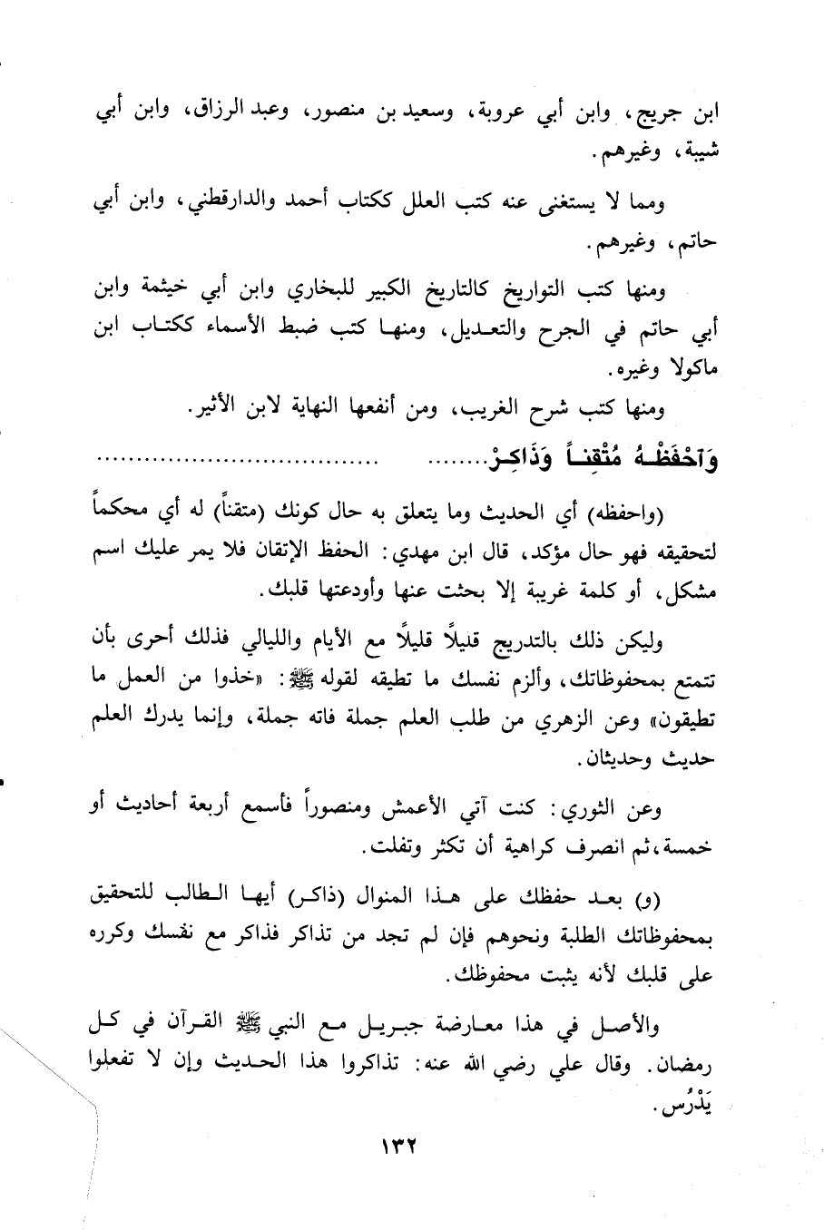 وليكن ذلك بالتدريج قليلًا قليلاً مع الأيام والليالي فذلك أحرى بأن تتمتع بمحفوظاتك، وألزم نفسك ما تطيقه لقوله - صلى الله عليه وسلم -: " خذوا من العمل ما تطيقون ". وعن الزهري من طلب العلم جملة فاته جملة، وإنما يدرك العلم حديث وحديثان.
