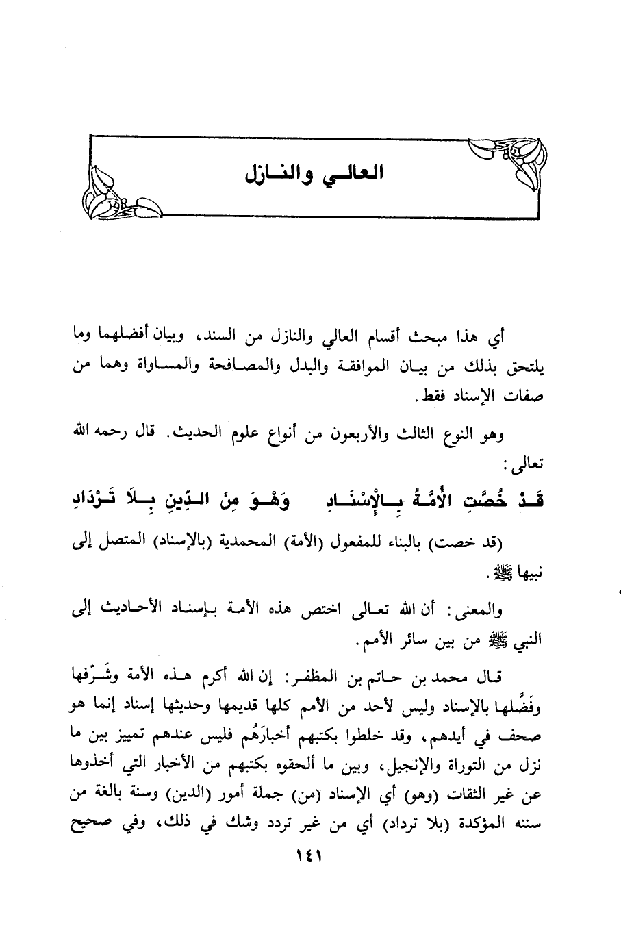 أي هذا مبحث أقسام العالي والنازل من السَّند، وبيان أفضلهما وما يلتحق بذلك من بيان الموافقة والبدل والمصافحة والمساواة وهما من صفات الإسناد فقط.