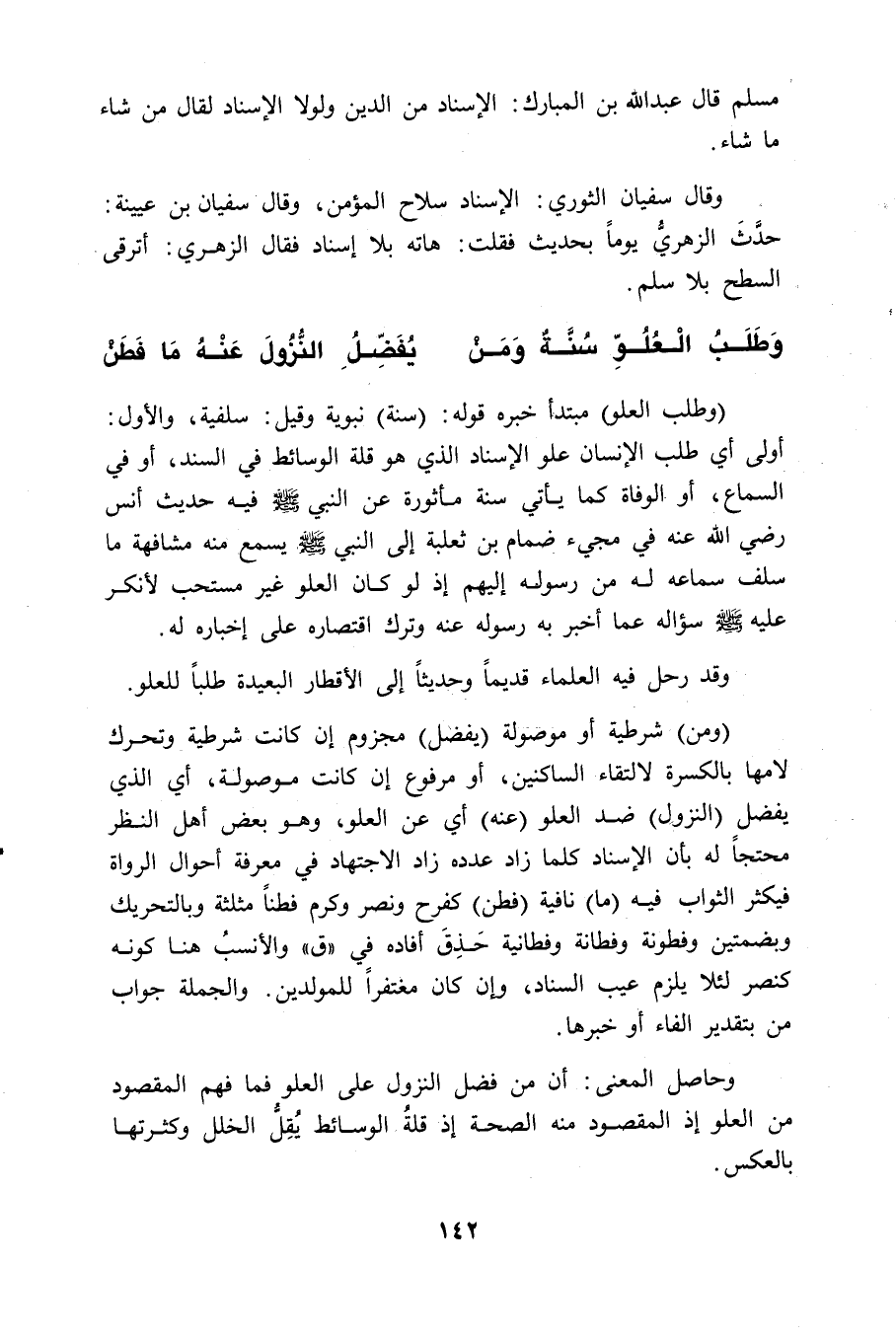(وطلب العلو) مبتدأ خبره قوله: (سنة) نبوية وقيل: سلفية، والأول: أولى أي طلب الإنسان علو الإسناد الذي هو قلة الوسائط في السَّند، أو في السماع، أو الوفاة كما يأتي سنة مأثورة عن النبي - صلى الله عليه وسلم - فيه حديث أنس - رضي الله عنه - في مجيء ضمام بن ثعلبة إلى النبي - صلى الله عليه وسلم -، يسمع منه مشافهة ما سلف سماعه له من رسوله إليهم إذ لو كان العلو غير مستحب لأنكر عليه - صلى الله عليه وسلم - سؤاله عما أخبر به رسوله عنه وترك اقتصاره على إخباره له.