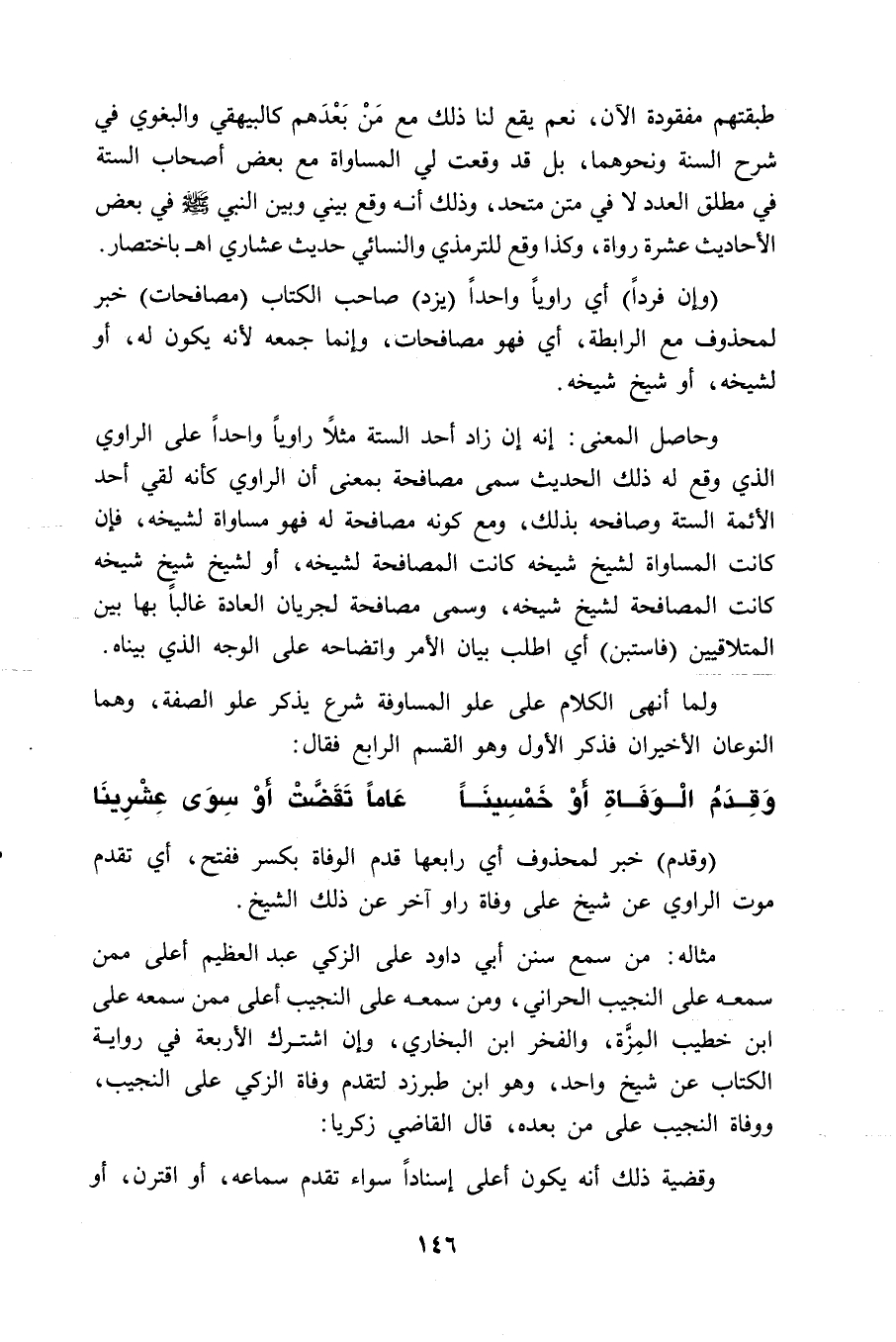 وحاصل المعنى: إنه إن زاد أحد الستة مثلاً راوياً واحداً على الراوي الذي وقع له ذلك الحديث سمى مصافحة بمعنى أن الراوي كأنه لقي أحد الأئمة الستة وصافحه بذلك، ومع كونه مصافحة له فهو مساواة لشيخه، فإن كانت المساواة لشيخ شيخه كانت المصافحة لشيخه، أو لشيخ شيخ شيخه كانت المصافحة لشيخ شيخه، وسمى مصافحة لجريان العادة غالبا بها بين المتلاقيين (فاستبن) أي اطلب بيان الأمر واتضاحه على الوجه الذي بيناه.