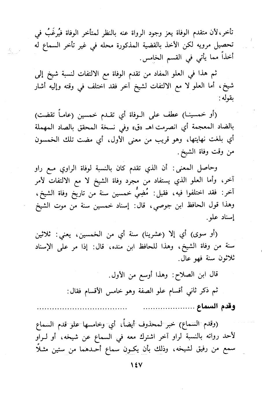 (وَقِدَمُ السَّمَاعِ) خبر لمحذوف أيضاً، أي وخامسها علو قدم السماع لأحد رواته بالنسبة لراو آخر اشترك معه في السماع عن شيخه، أو لراو سمع من رفيق لشيخه، وذلك بأن يكون سماع أحدهما من ستين مثلاً