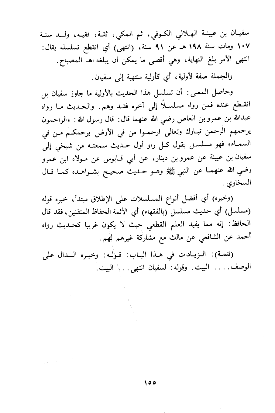 وحاصل المعنى: أن تسلسل هذا الحديث بالأولية ما جاوز سفيان بل انقطع عنده فمن رواه مسلسلاً إلى آخره فقد وهم. والحديث ما رواه عبد الله بن عمرو بن العاص - رضي الله عنهما - قال: قال رسول الله: " الراحمون يرحمهم الرحمن تبارك وتعالى ارحموا من في الأرض يرحمكم من في السماء " فهو مسلسل بقول كل راو أول حديث سمعته من شيخي إلى سفيان بن عيينة عن عمرو بن دينار، عن أبي قابوس عن مولاه ابن عمرو - رضي الله عنهما - عن النبي - صلى الله عليه وسلم - وهو حديث صحيح بشواهده كما قال السخاوي.