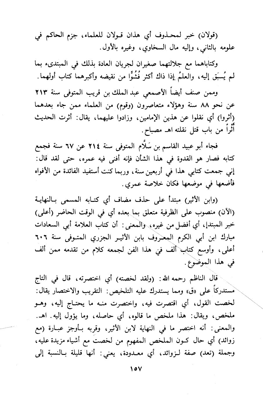 وممن صنف أيضاً الأصمعي عبد الملك بن قريب المتوفى سنة 213 عن نحو 88 سنة وهؤلاء متعاصرون (وقوم) من العلماء ممن جاء بعدهما (أثروا) أي نقلوا عن هذين الإمامين، وزادوا عليهما، يقال: أثرت الحديث أثْراً من باب قتل نقلته. اهـ مصباح.