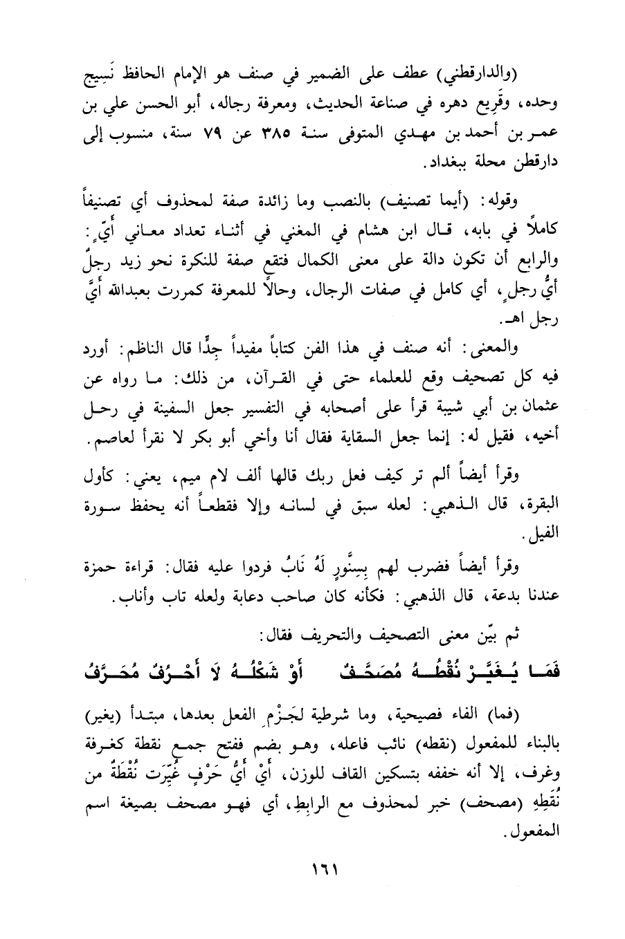 (والدارقطني) عطف على الضمير في صنف هو الإمام الحافظ نَسِيج وحده، وقَرِيع دهره في صناعة الحديث، ومعرفة رجاله، أبو الحسن علي بن عمر بن أحمد بن مهدي المتوفى سنة 385 عن 79 سنة، منسوب إلى دارقطن محلة ببغداد.