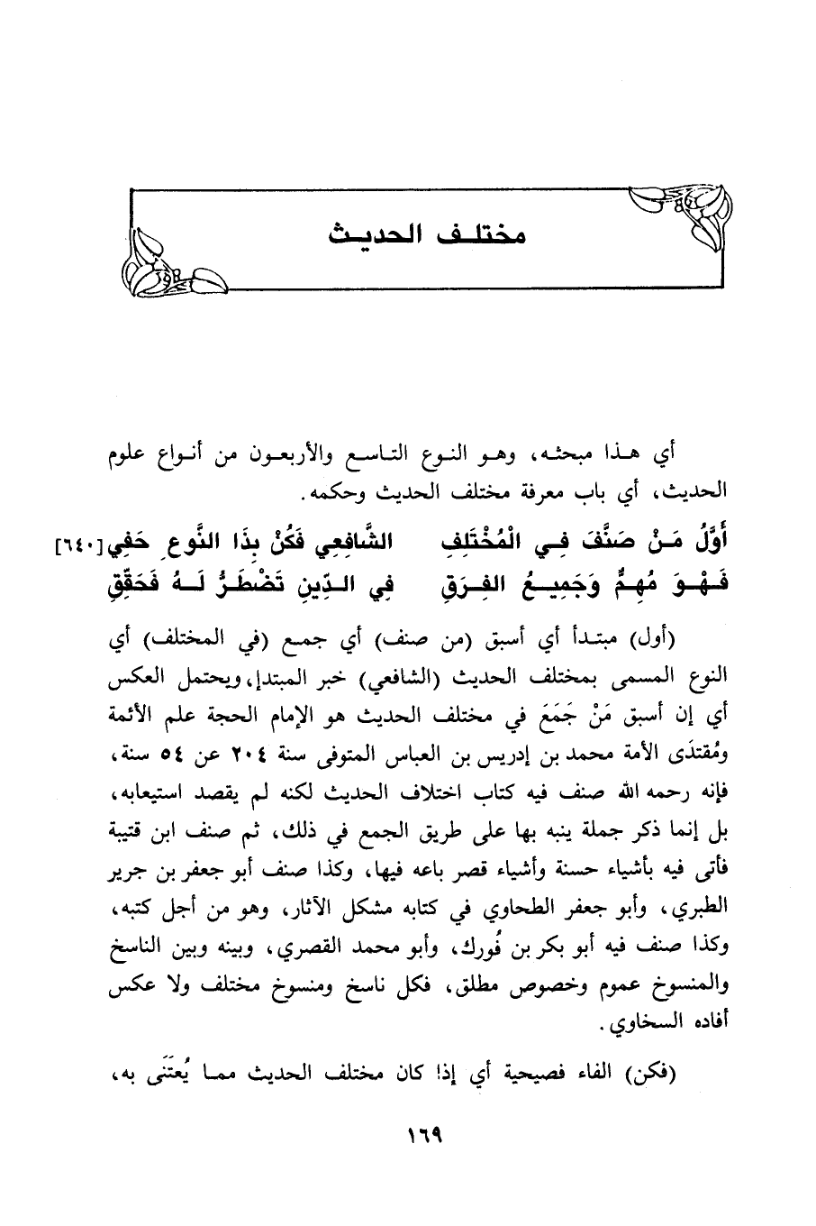 (أول) مبتدأ أي أسبق (من صنف) أى جمع (في المختلف) أي النوع المسمى بمختلف الحديث (الشافعي) خبر المبتدإ، ويحتمل العكس أي إن أسبق مَنْ جَمَع في مختلف الحديث هو الإمام الحجة علم الأئمة ومُقتدَى الأمة محمد بن إدريمس بن العباس المتوفى سنة 204 عن 54 سنة، فإنه رحمه الله صنف فيه كتاب اختلاف الحديث لكنه لم يقصد استيعابه، بل إنما ذكر جملة ينبه بها على طريق الجمع في ذلك، ثم صنف ابن قتيبة فأتى فيه بأشياء حسنة وأشياء قصر باعه فيها، وكذا صنف أبو جعفر بن جرير الطبري، وأبو جعفر الطحاوي في كتابه مشكل الآثار، وهو من أجل كتبه، وكذا صنف فيه أبو بكر بن فُورك، وأبو محمد القصري، وبينه وبين الناسخ والمنسوخ عموم وخصوص مطلق، فكل ناسخ ومنسوخ مختلف ولا عكس أفاده السخاوي.