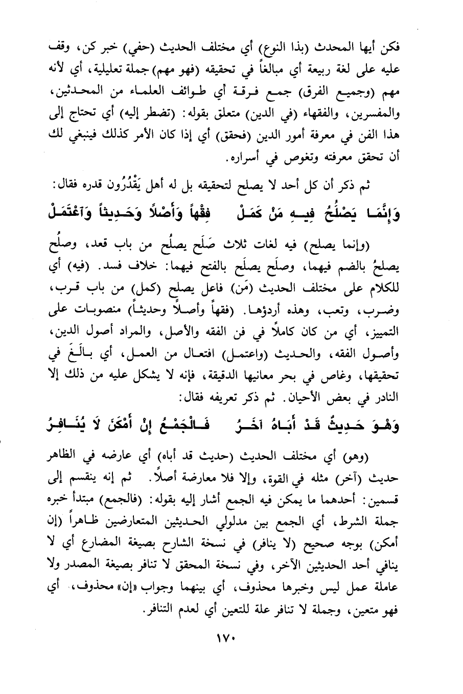 (وإنما يصلح) فيه لغات ثلاث صَلَح يصلُح من باب قعد، وصلُح يصلحُ بالضم فيهما، وصلَح يصلَح بالفتح فيهما: خلاف فسد. (فيه) أي للكلام على مختلف الحديث (مَن) فاعل يصلح (كمل) من باب قرب، وضرب، وتعب، وهذه أردؤها. (فقهاً وأصلاً وحديثاً) منصوبات على التمييز، أي من كان كاملًا في فن الفقه والأصل، والمراد أصول الدين، وأصول الفقه، والحديث (واعتمل) افتعال من العمل، أي بالَغَ في تحقيقها، وغاص في بحر معانيها الدقيقة، فإنه لا يشكل عليه من ذلك إلا النادر في بعض الأحيان. ثم ذكر تعريفه فقال: