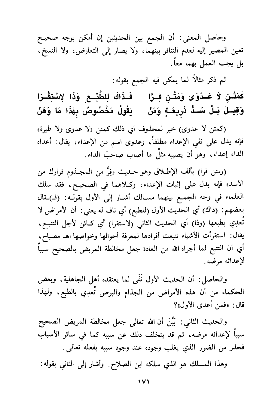 (ومَتْنِ فِرَّا) بألف الإطلاق وهو حديث " فِرَّ من المجذوم فرارك من الأسد " فإنه يدل على إثبات الإعداء، وكلاهما في الصَّحِيح، فقد سلك العلماء في وجه الجمع بينهما مسالك أشار إلى الأول بقوله: (فـ) ـقال بعضهم: (ذاك) أي الحديث الأول (للطبع) أي ناف له يعني: أن الأمراض لا تُعدِي بطبعها (وذا) أي الحديث الثاني (لاستقرا) أي كائن لأجل التتبع، يقال: استقرأت الأشياء تتبعت أفرادها لمعرفة أحوالها وخواصها. اهـ مصباح، أي أن التتبع لما أجراه الله من العادة جعل مخالطة المريض بالصَّحِيح سبباً لإعدائه مرضه.