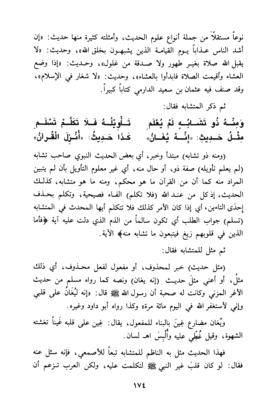 (ومنه ذو تشابه) مبتدأ وخبر، أي بعض الحديث النبوي صاحب تشابه (لم يعلم تأويله) صفة ذو، أو حال منه، أي غير معلوم التأويل بأن لم يتبين المراد منه كما أن من القرآن ما هو محكم، ومنه ما هو متشابه، كذلك الحديث، إذكل من عند الله (فلا تكلم) الفاء فصيحية، وتكلم بحذف إِحدَى التاءين، أي إذا كان الأمر كذلك فلا تتكلم أيها المحدث في المتشابه (تسلم) جواب الطلب أي تكون سالماً من الذم الذي دلت عليه آية (فَأَمَّا الَّذِينَ فِي قُلُوبِهِمْ زَيْغٌ فَيَتَّبِعُونَ مَا تَشَابَهَ مِنْهُ) الآية.