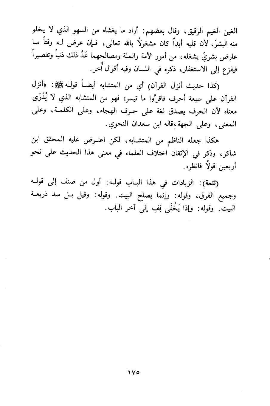هكذا جعله الناظم من المتشابه، لكن اعترض عليه المحقق ابن شاكر، وذكر في الإتقان اختلاف العلماء في معنى هذا الحديث على نحو أربعين قولاً فانظره.
