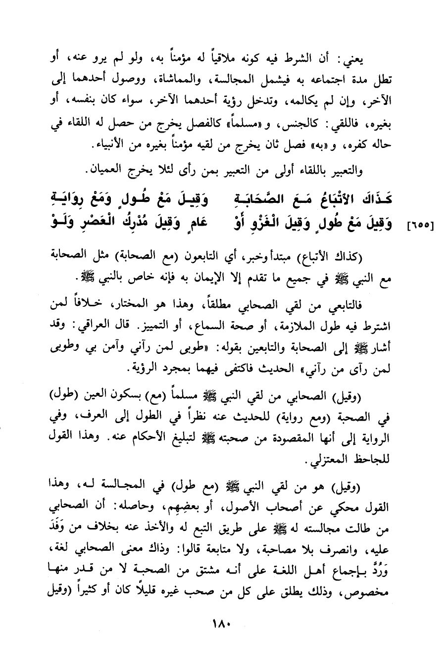(وقيل) الصحابي من لقي النبي - صلى الله عليه وسلم - مسلماً (مع) بسكون العين (طول) في الصحبة (ومع رواية) للحديث عنه نظراً في الطول إلى العرف، وفي الرواية إلى أنها المقصودة من صحبته - صلى الله عليه وسلم - لتبليغ الأحكام عنه. وهذا القول للجاحظ المعتزلي.
