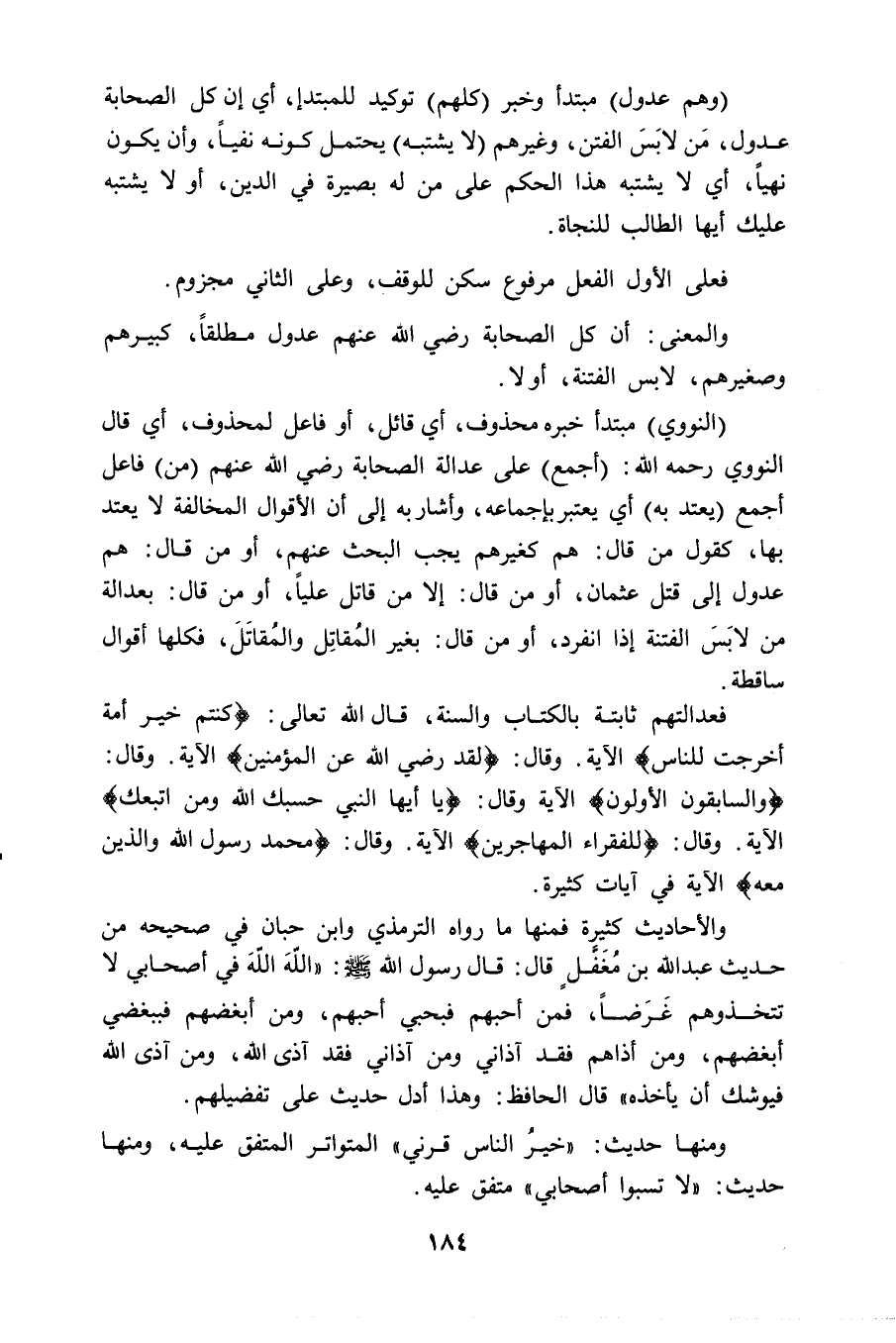 (وهم عدول) مبتدأ وخبر (كلهم) توكيد للمبتدإ، أي إن كل الصحابة عدول، مَن لابَسَ الفتن، وغيرهم (لا يشتبه) يحتمل كونه نفياً، وأن يكون نهياً، أي لا يشتبه هذا الحكم على من له بصيرة في الدين، أو لا يشتبه عليك أيها الطالب للنجاة.