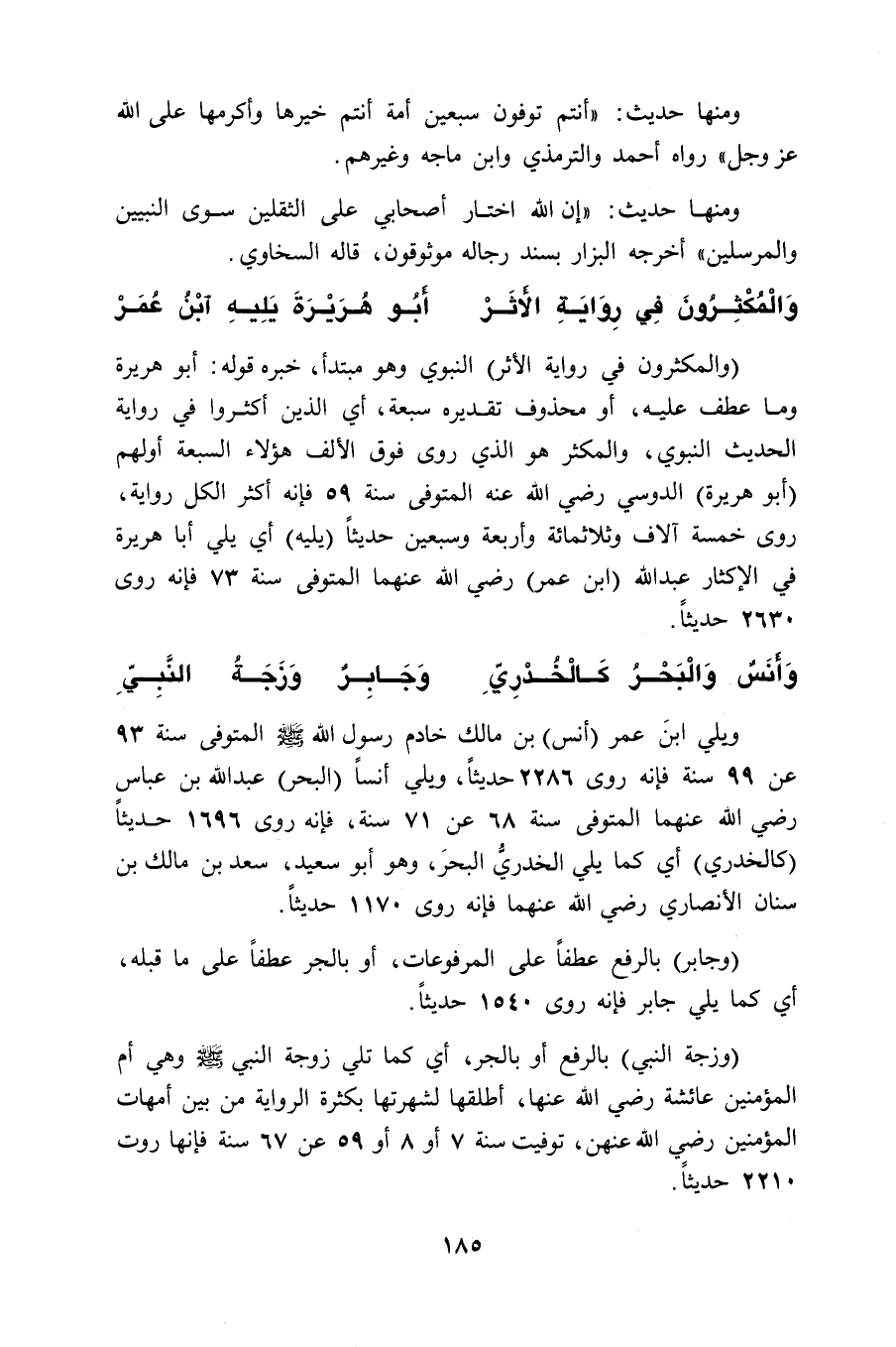 (والمكثرون في رواية الأثر) النبوي وهو مبتدأ، خبره قوله: أبو هريرة وما عطف عليه، أو محذوف تقديره سبعة، أي الذين أكثروا في رواية الحديث النبوي، والمكثر هو الذي روى فوق الألف هؤلاء السبعة أولهم (أبو هريرة) الدوسي - رضي الله عنه - المتوفى سنة 59 فإنه أكثر الكل رواية، روى خمسة آلاف وثلاثمائة وأربعة وسبعين حديثاً (يليه) أي يلي أبا هريرة في الإكثار عبد الله (ابن عمر) - رضي الله عنهما - المتوفى سنة 73 فإنه روى 2630 حديثاً.