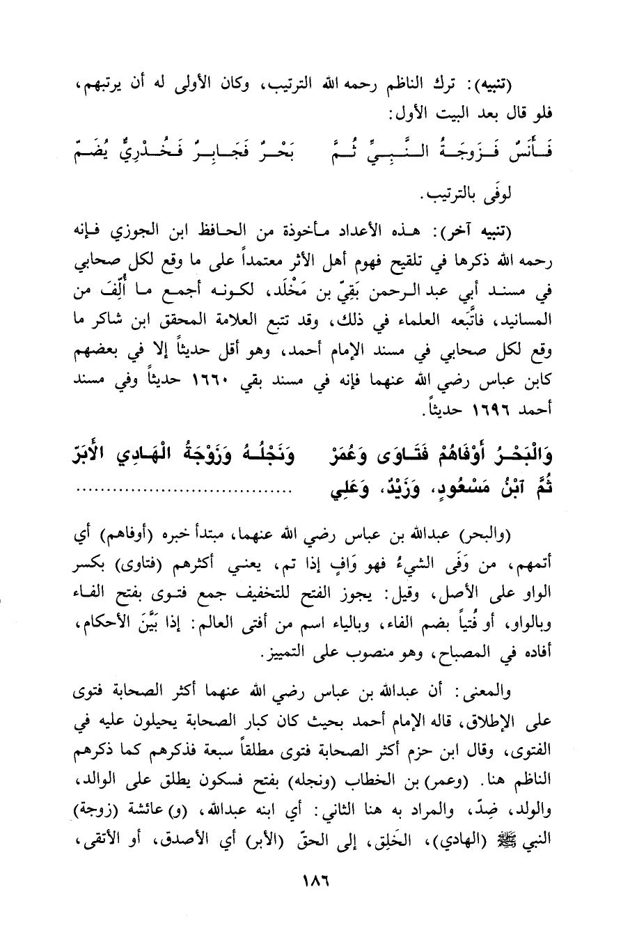والمعنى: أن عبد الله بن عباس - رضي الله عنهما - أكثر الصحابة فتوى على الإطلاق، قاله الإمام أحمد بحيث كان كبار الصحابة يحيلون عليه في الفتوى، وقال ابن حزم أكثر الصحابة فتوى مطلقاً سبعة فذكرهم كما ذكرهم الناظم هنا. (وعمر) بن الخطاب (ونجله) بفتح فسكون يطلق على الوالد، والولد، ضِدّ، والمراد به هنا الثاني: أي ابنه عبد الله، (و) عائشة (زوجة) النبي - صلى الله عليه وسلم - (الهادي)، الخلق، إلى الحقّ (الأبر) أي الأصدق، أو الأتقى،