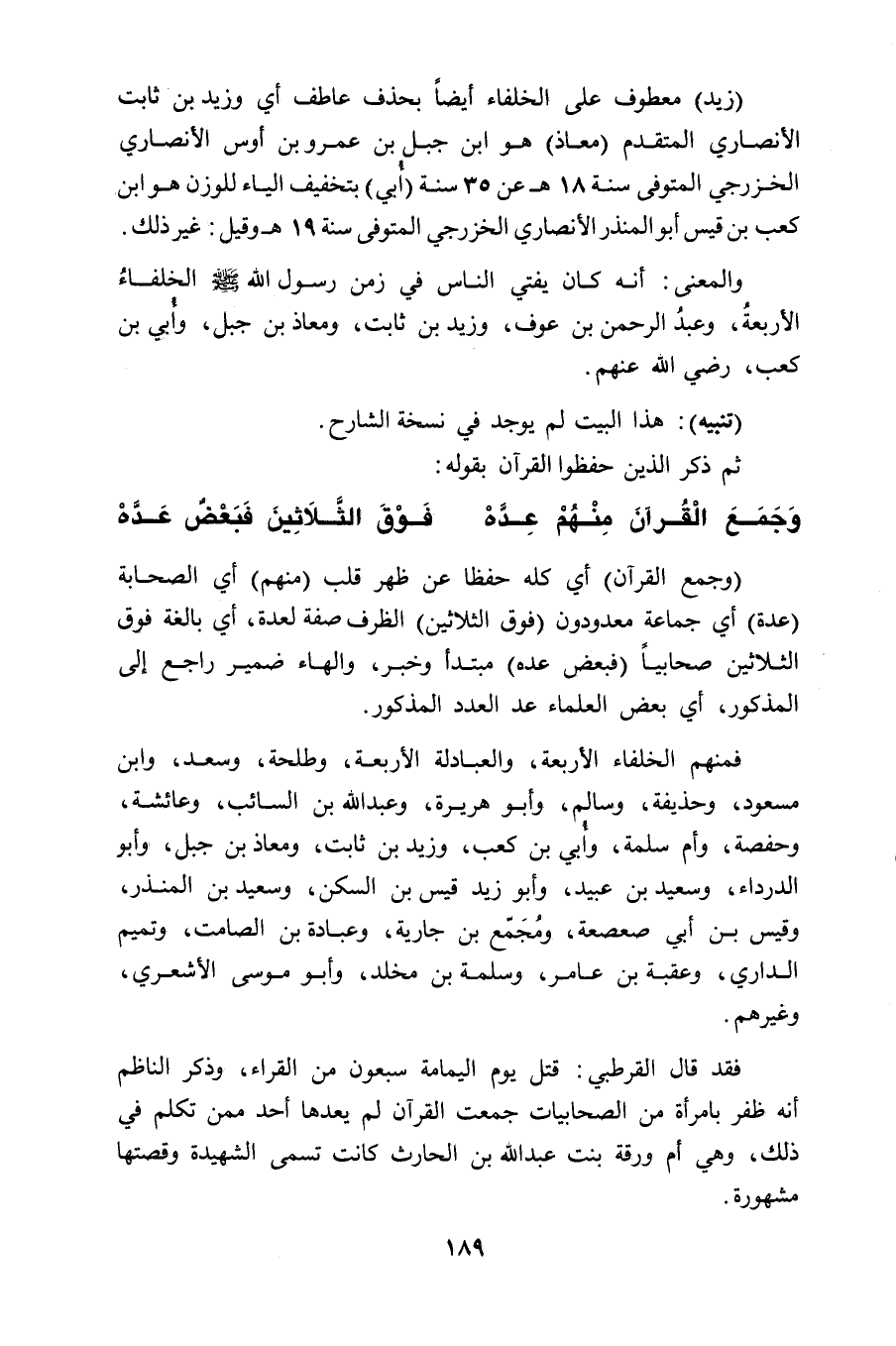 (وجمع القرآن) أي كله حفظا عن ظهر قلب (منهم) أي الصحابة (عدة) أي جماعة معدودون (فوق الثلاثين) الظرف صفة لعدة، أي بالغة فوق الثلاثين صحابياً (فَبَعْضٌ عَدَّهْ) مبتدأ وخبر، والهاء ضمير راجع إلى المذكور، أي بعض العلماء عد العدد المذكور.
