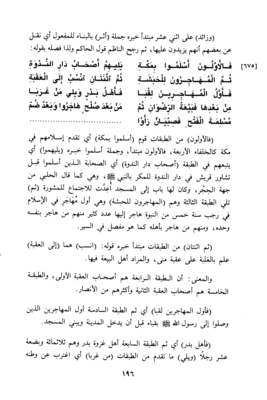 (فالأولون) من الطبقات قوم (أسلموا بمكة) أي تقدم إسلامهم في مكة كالخلفاء الأربعة، فالأولون مبتدأ، وجملة أسلموا خبره (يليهموا) أي يتبعهم في الطبقة (أصحاب دار الندوة) أي الصحابة الذين أسلموا قبل تشاور قريش في دار الندوة للمكر بالنبي - صلى الله عليه وسلم -، وهي كما قال الحلبي من جهة الحِجْر، وكان لها باب إلى المسجد أُعِدَّت للاجتماع للمشورة (ثم) تلي الطبقة الثالثة وهم (المهاجرون للحبشة) وهي أول مُهَاجَرِ في الإسلام في رجب سنة خمس من النبوة هاجر إليها عدد كثير منهم من هاجر بنفسه وحده، ومنهم من هاجر بأهله كما هو مفصل في السير.