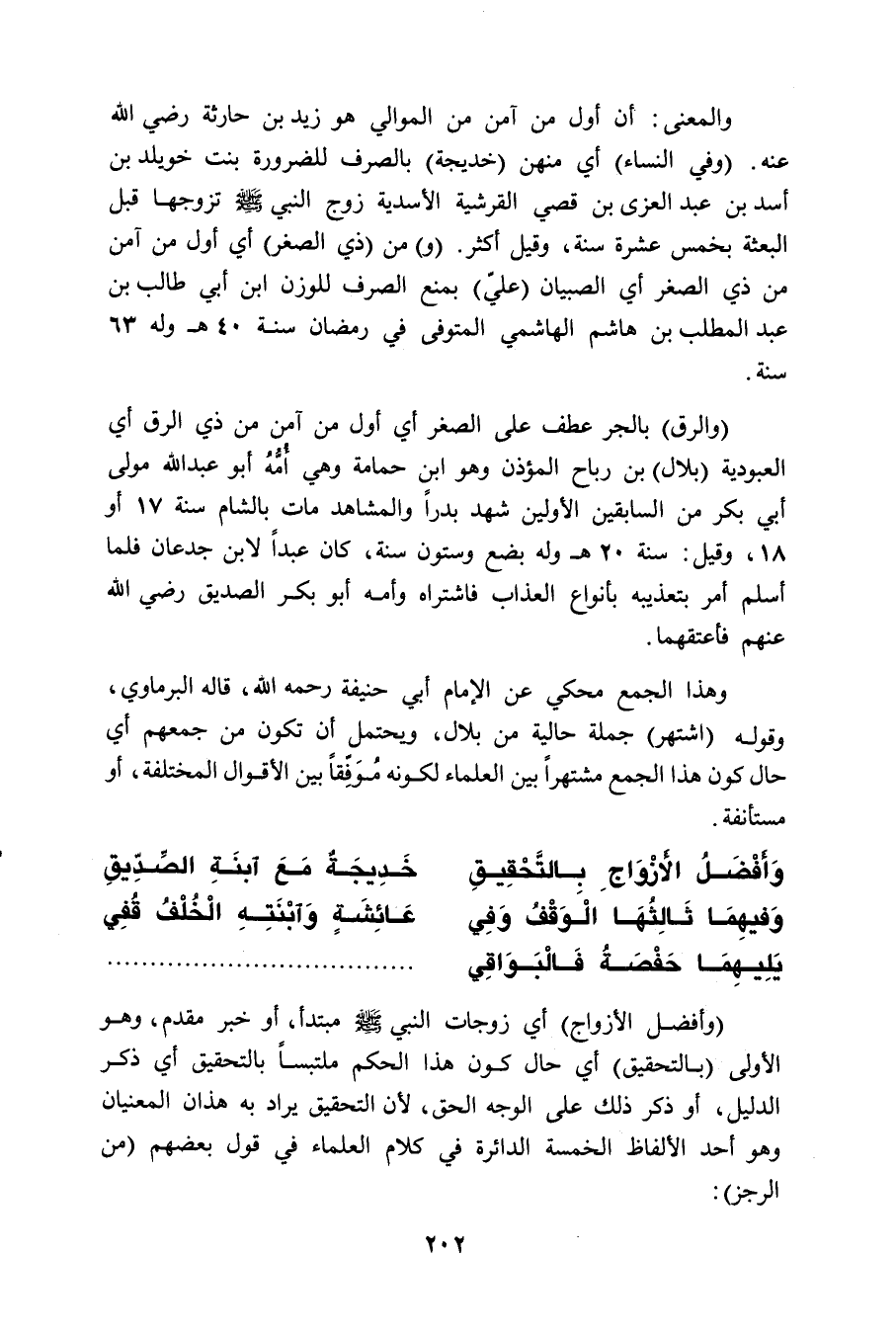 والمعنى: أن أول من آمن من الموالي هو زيد بن حارثة - رضي الله عنه -. (وفي النساء) أي منهن (خديجة) بالصرف للضرورة بنت خويلد بن أسد بن عبد العزى بن قصي القرشية الأسدية زوج النبي - صلى الله عليه وسلم - تزوجها قبل البعثة بخمس عشرة سنة، وقيل أكثر. (و) من (ذِي الصِّغَرْ) أي أول من آمن من ذي الصغر أي الصبيان (عليٌّ) بمنع الصرف للوزن ابن أبي طالب بن عبد المطلب بن هاشم الهاشمي المتوفى في رمضان سنة 40 هـ وله 63 سنة.