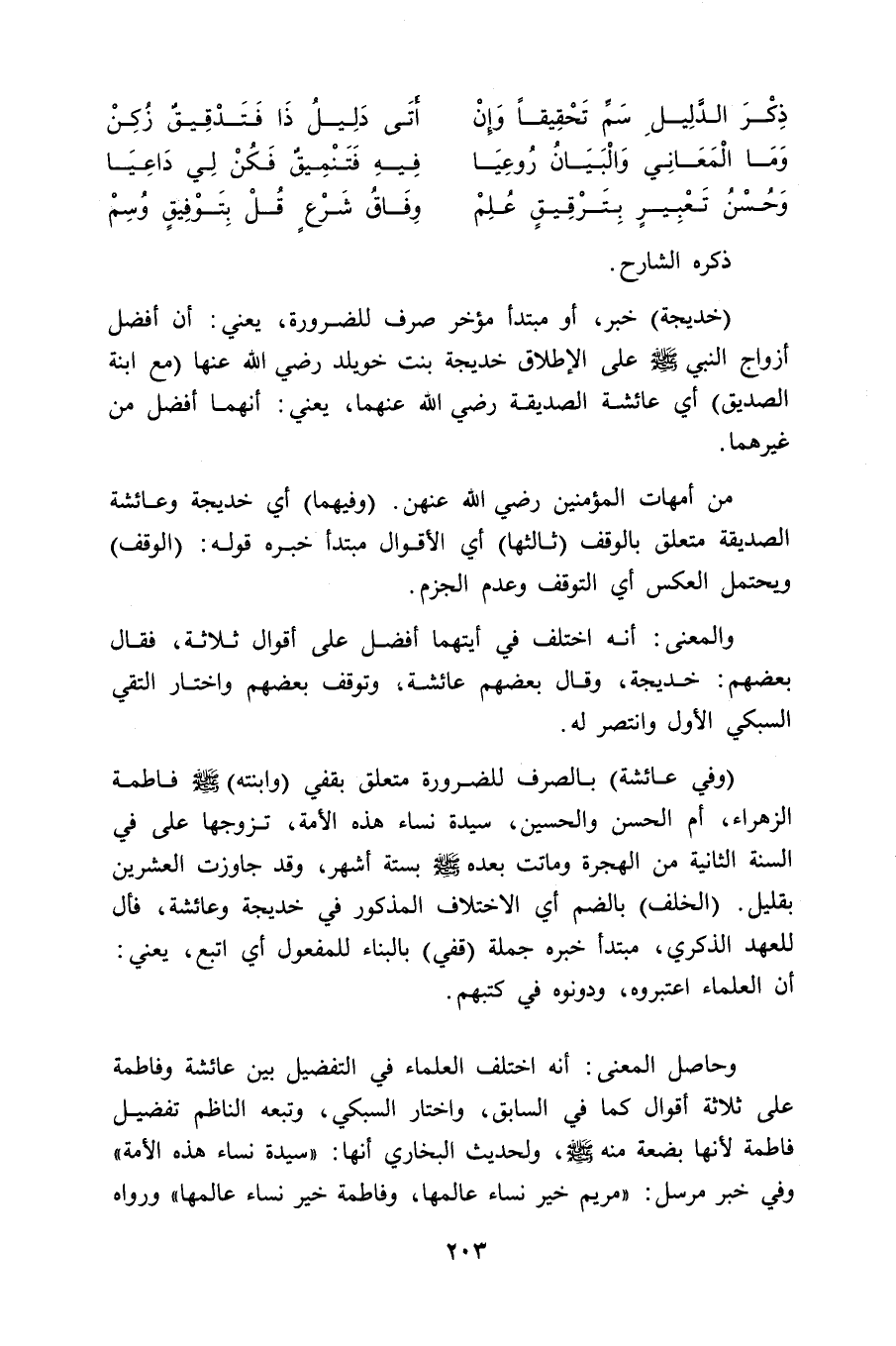 (خديجة) خبر، أو مبتدأ مؤخر صرف للضرورة، يعني: أن أفضل أزواج النبي - صلى الله عليه وسلم - على الإطلاق خديجة بنت خويلد - رضي الله عنها - (مع ابنة الصديق) أي عائشة الصديقة - رضي الله عنهما -، يعني: أنهما أفضل من غيرهما.