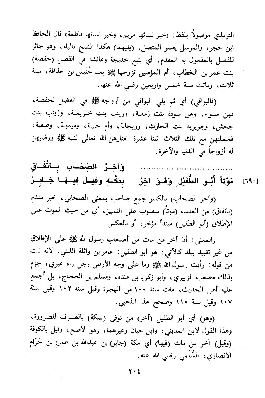 (وآخر الصحاب) بالكسر جمع صاحب بمعنى الصحابي، خبر مقدم (باتفاق) من العلماء (موتاً) منصوب على التمييز، أي من حيث الموت على الإطلاق (أبو الطفيل) مبتدأ مؤخر، أو بالعكس.