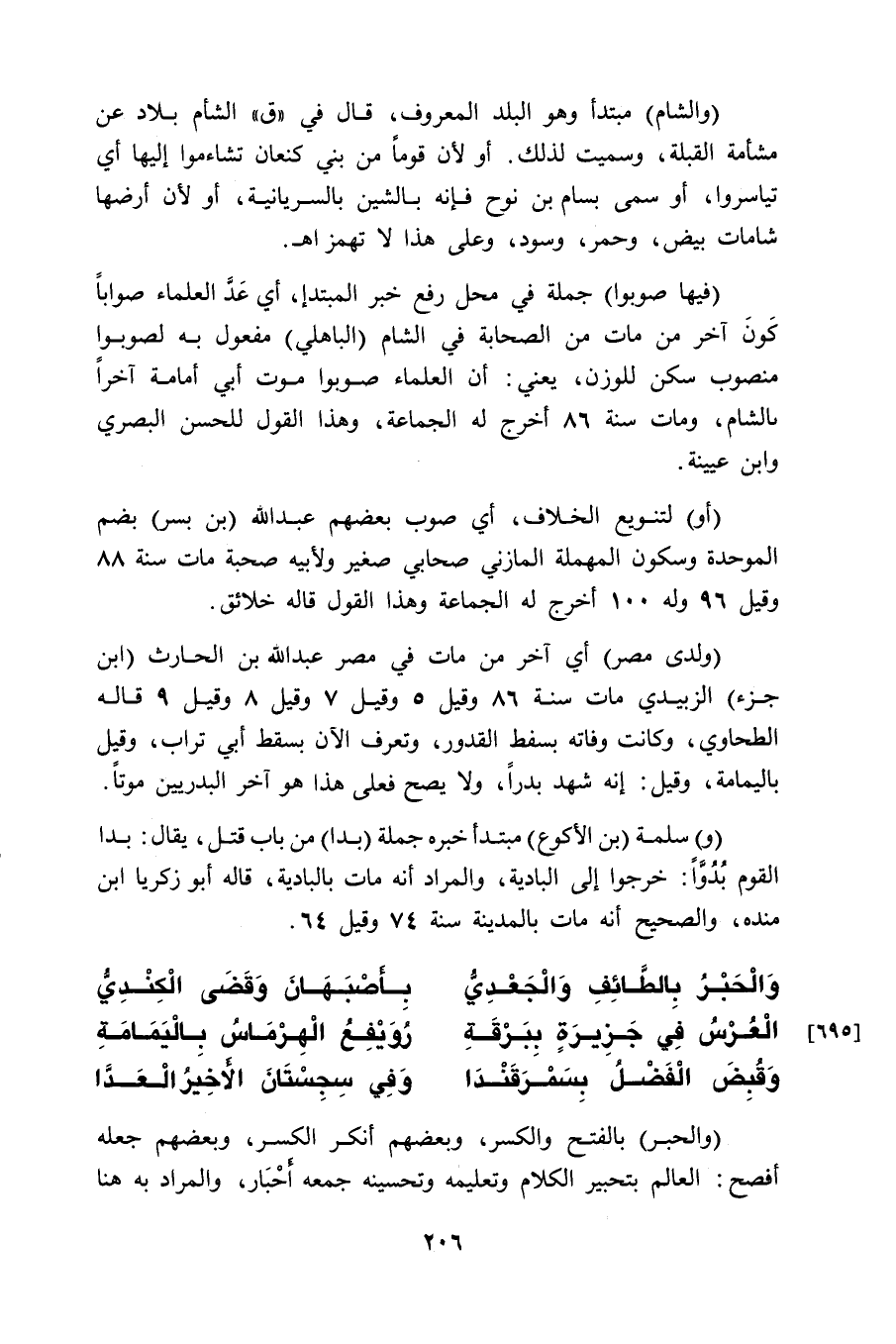 (فيها صوبوا) جملة في محل رفع خبر المبتدإ، أي عَدَّ العلماء صواباً كَونَ آخر من مات من الصحابة في الشام (الباهلي) مفعول به لصوبوا منصوب سكن للوزن، يعني: أن العلماء صوبوا موت أبي أمامة آخراً بالشام، ومات سنة 86 أخرج له الجماعة، وهذا القول للحسن البصري وابن عيينة.