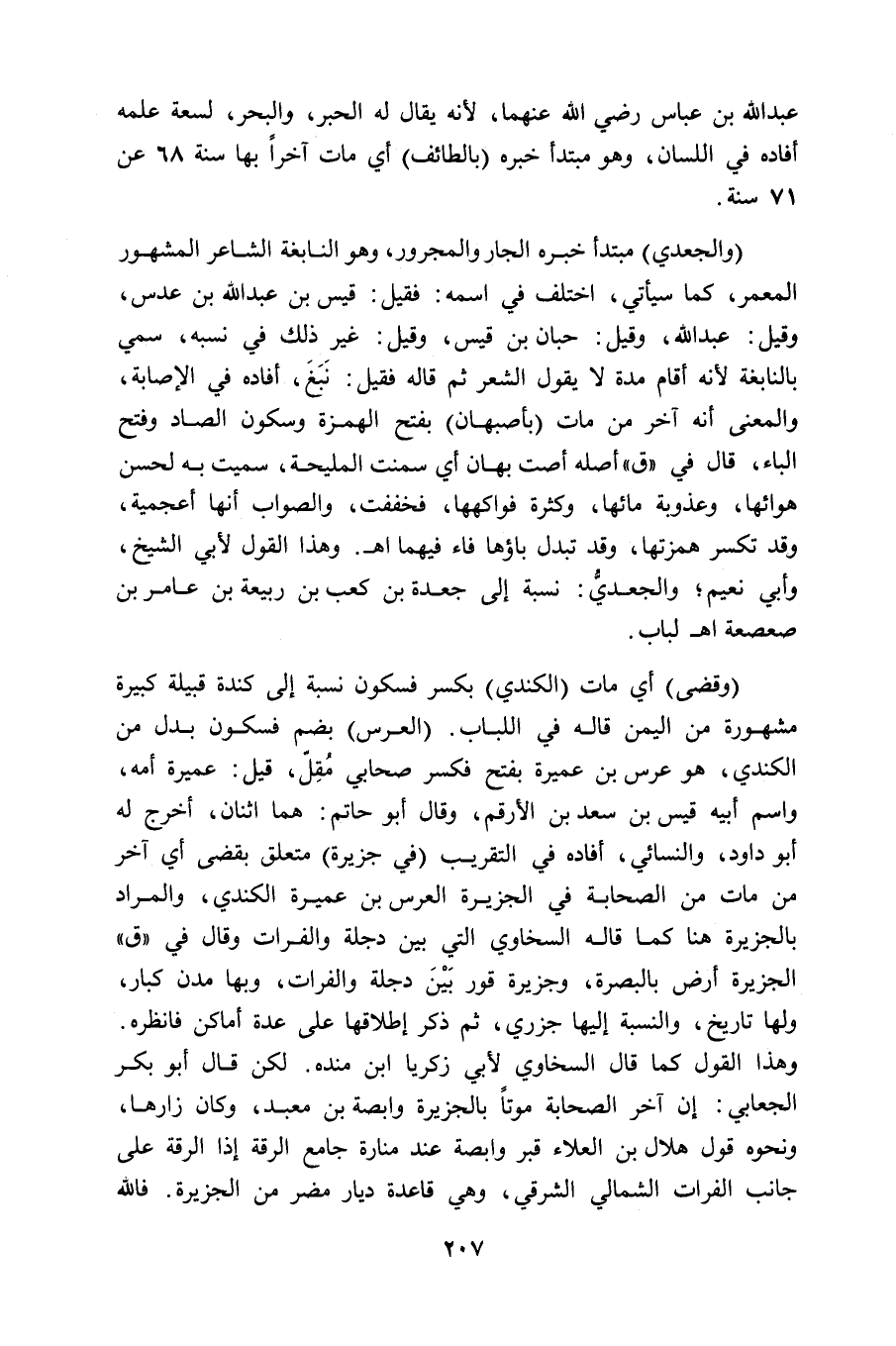 (والجعدي) مبتدأ خبره الجار والمجرور، وهو النابغة الشاعر المشهور المعمر، كما سيأتي، اختلف في اسمه: فقيل: قيس بن عبد الله بن عدس، وقيل: عبد الله، وقيل: حبان بن قيس، وقيل: غير ذلك في نسبه، سمي بالنابغة لأنه أقام مدة لا يقول الشعر ثم قاله فقيل: نَبَغَ، أفاده في الإصابة، والمعنى أنه آخر من مات (بأصبهان) بفتح الهمزة وسكون الصاد وفتح الباء، قال في " ق " أصله أصت بهان أي سمنت المليحة، سميت به لحسن هوائها، وعذوبة مائها، وكثرة فواكهها، فخففت، والصواب أنها أعجمية، وقد تكسر همزتها، وقد تبدل باؤها فاء فيهما اهـ. وهذا القول لأبي الشيخ، وأبي نعيم؛ والجعديُّ: نسبة إلى جعدة بن كعب بن ربيعة بن عامر بن صعصعة. اهـ لباب.