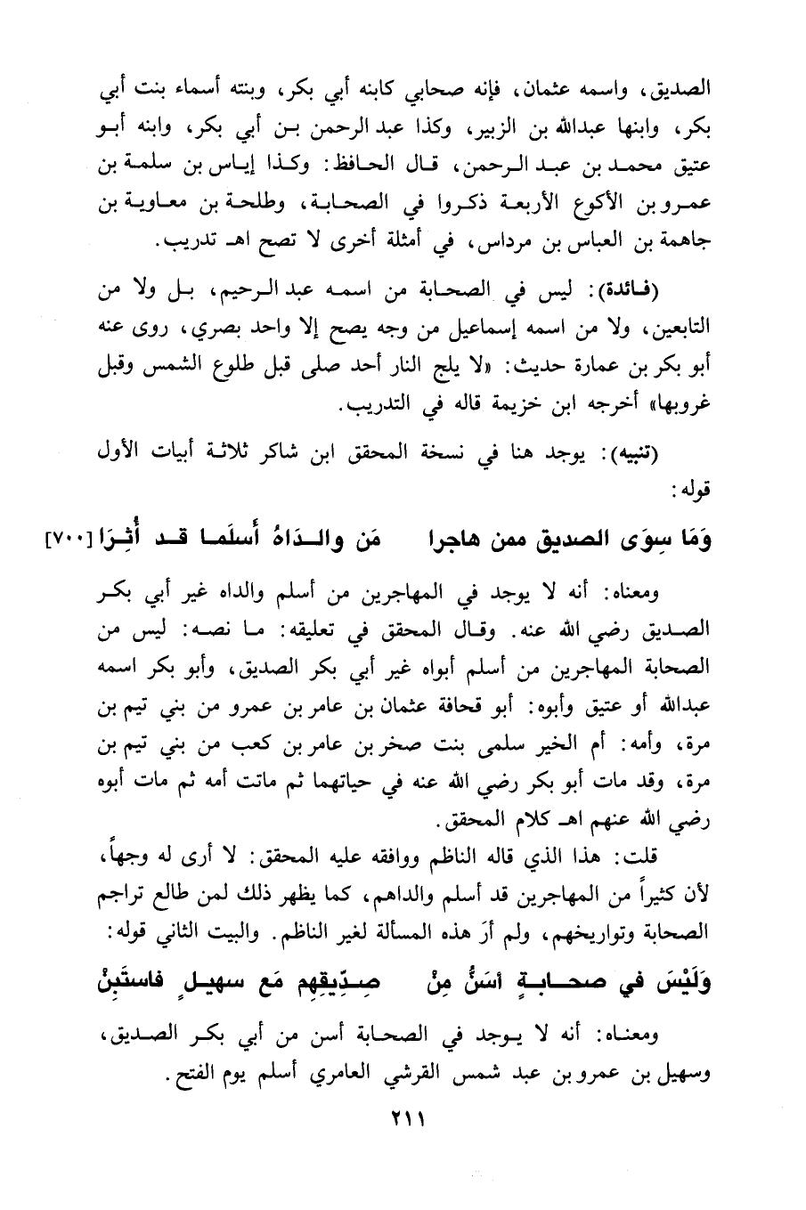 قلت: هذا الذي قاله الناظم ووافقه عليه المحقق: لا أرى له وجهاً، لأن كثيراً من المهاجرين قد أسلم والداهم، كما يظهر ذلك لمن طالع تراجم الصحابة وتواريخهم، ولم أرَ هذه المسألة لغير الناظم. والبيت الثاني قوله: