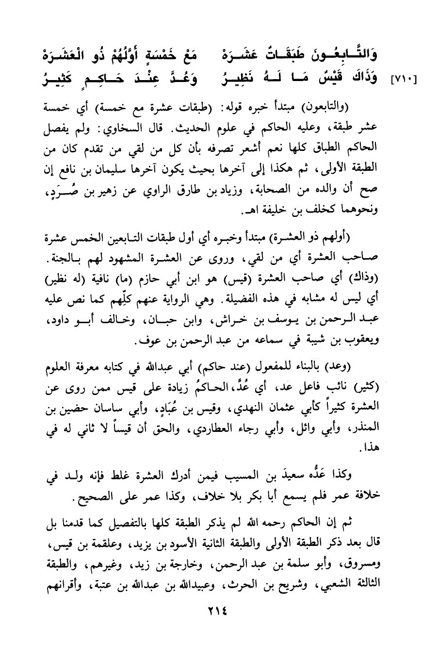 (والتابعون) مبتدأ خبره قوله: (طبقات عشرة مع خمسة) أي خمسة عشر طبقة، وعليه الحاكم في علوم الحديث. قال السخاوي: ولم يفصل الحاكم الطباق كلها نعم أشعر تصرفه بأن كل من لقي من تقدم كان من الطبقة الأولى، ثم هكذا إلى آخرها بحيث يكون آخرها سليمان بن نافع إن صح أن والده من الصحابة، وزياد بن طارق الراوي عن زهير بن صُرَدٍ، ونحوهما كخلف بن خليفة اهـ.